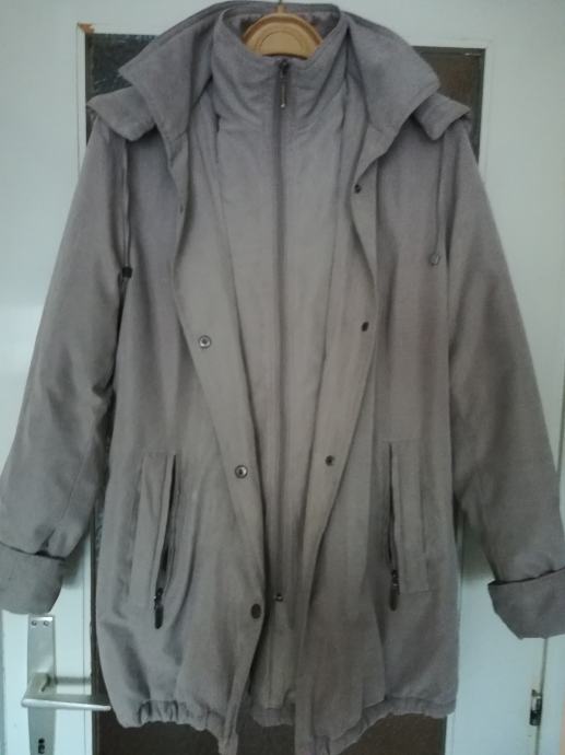 Topla i kvalitetna zimska jakna s dvostrukim kopčanjem (patentni zatvarač i gumbi), s više džepova i kapuljačom koja se može skinuti, nenošena. Sivkaste boje, veličina XL (odgovara broju 42)