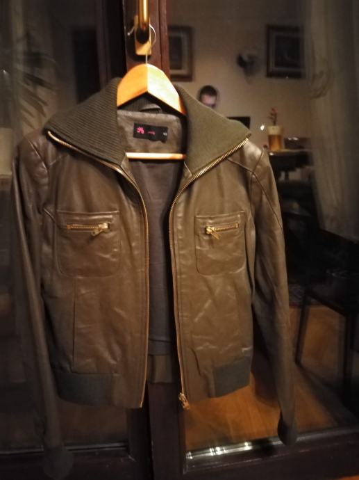 Ženska kožna jakna Oviesse Young, veličina 42. Materijal je koža, pamuk i poliester. Boja je smeđe zelena. Kontakt 091 556 3382