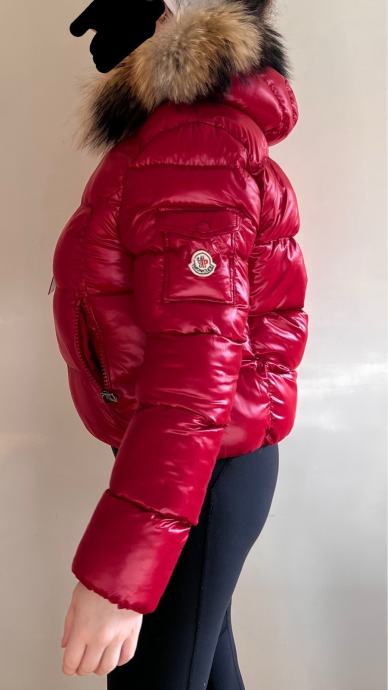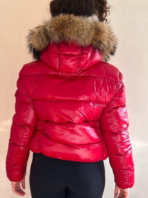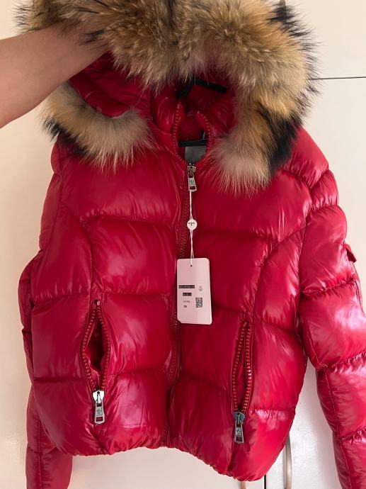 Nova ženska pernata jakna u crvenoj boji s etiketom, veličina 38. Elegantna zimska jakna s krznenim obrubom na kapuljači i modernim sjajnim završetkom. Idealna za hladne zimske dane, topla i moderno skrojena.