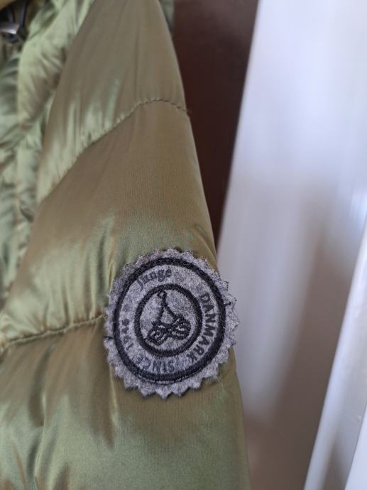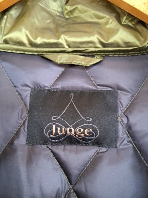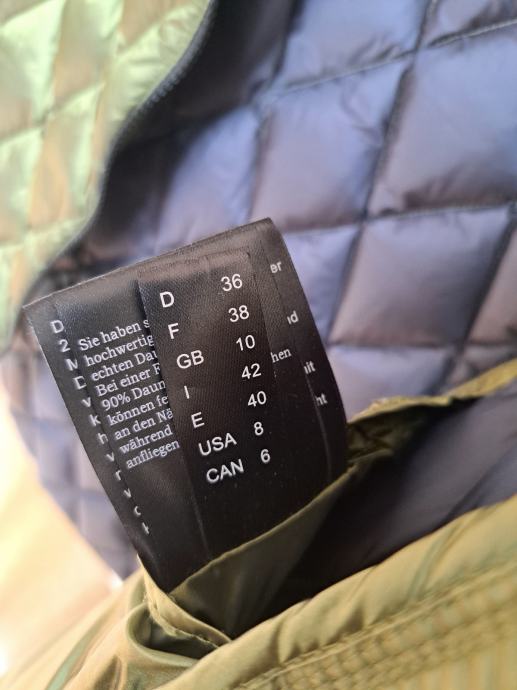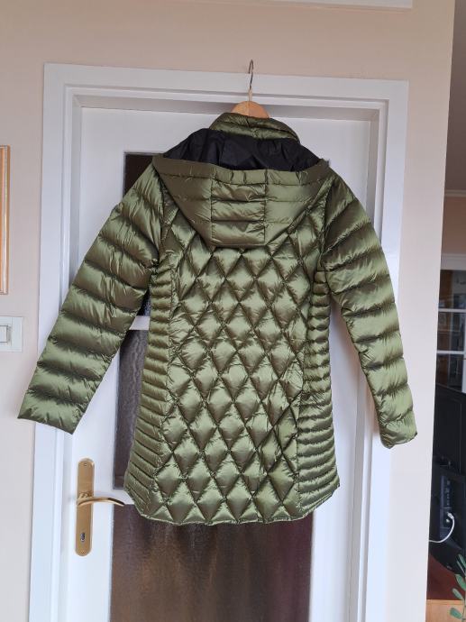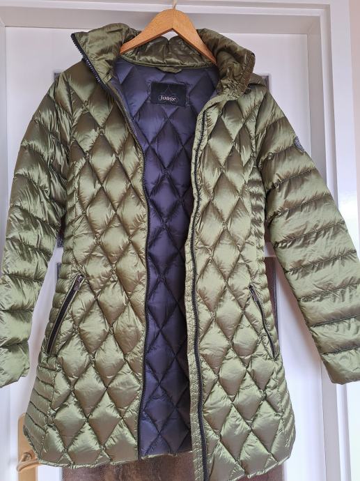 Jakna Junge, ispunjena perjem, vrlo lagana i ugodna za nošenje poput mantila. Krasna kivi zelena boja s diskretnim sjajem. Skidiva kapuljača. Izgleda kao nova, malo nošena.