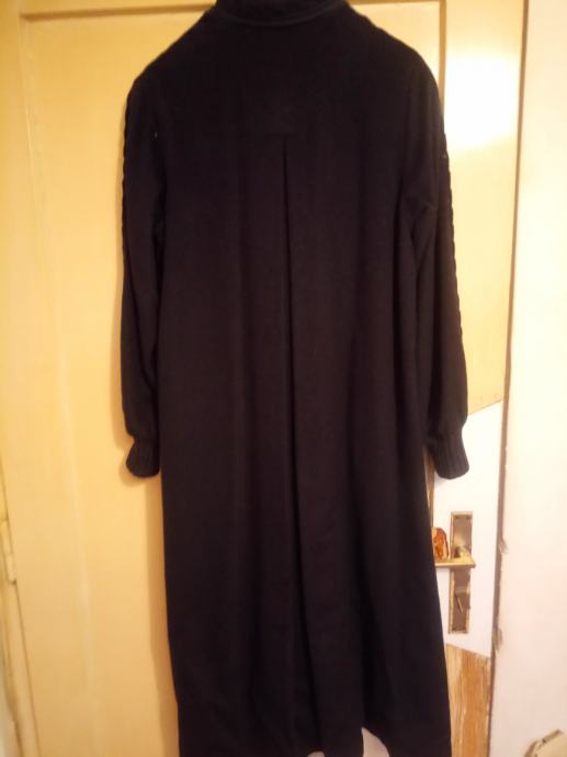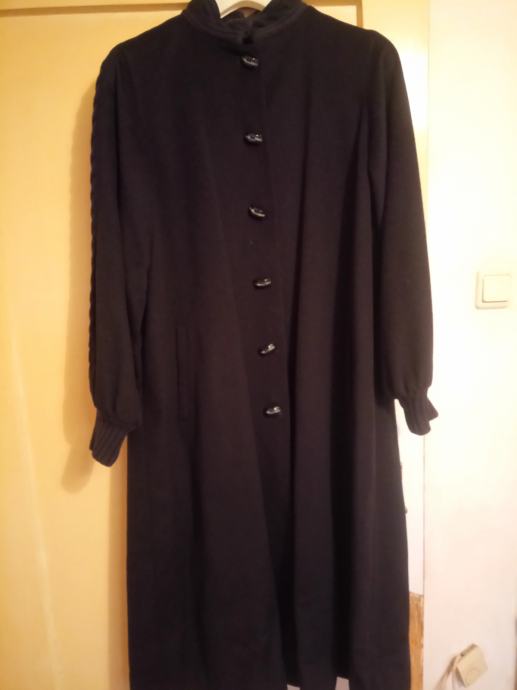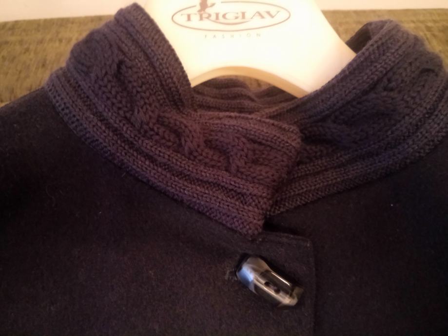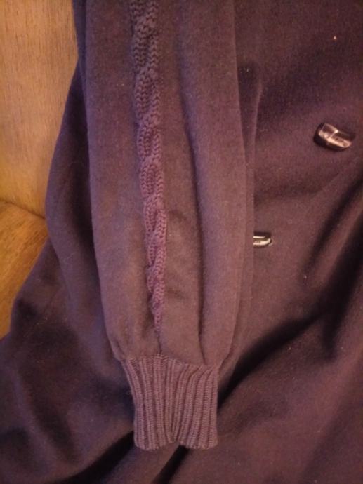 Tamnoplavi ženski kaput,zanimljiv kroj s ruskom kragnom i motivom pletenica na rukavima i ovratniku,čista vuna,nov,broj 40.