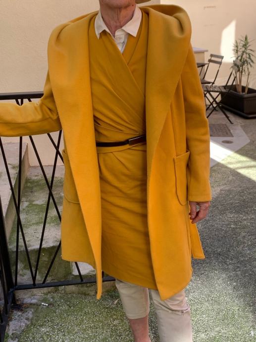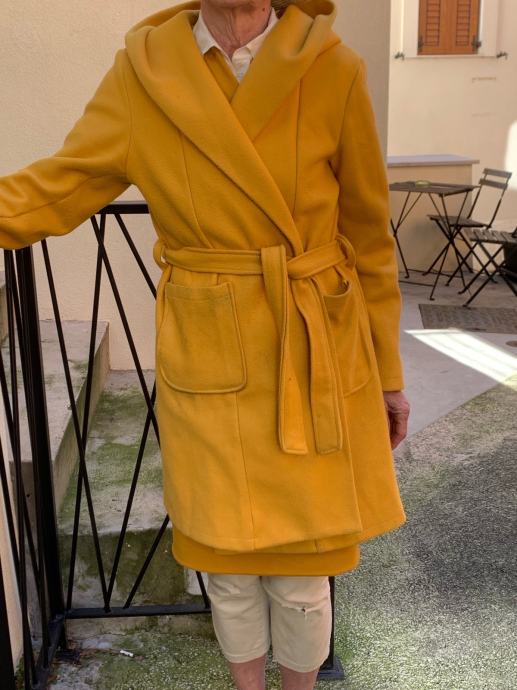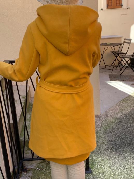 Zenski kaput zuti sa kapuljacom, univerzalni broj, nema kopcanja samo pojas, malo nosen