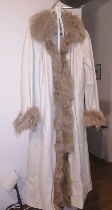 Zenski kozni kaput podstavljen krznom, bijeli, duzi, novo, br L