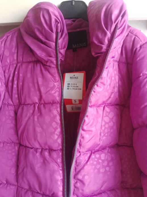 Nova topla debela sportska pernata zimska ženska jakna kao skafander s punjenjem pa može za snijeg i kišu marka MANA , veličina S / 36 . Inače dođe 39,99 eura. Nekorištena, samo u medjuvremenu strgnuta etiketa. Ne odgovara nam veličina. Prekrasna boja ciklame. Visoki topli ovratnik. Punjena debelom podstavom. Može biti kao poklon za Božić i blagdane . Prodajem za 8 eura + pt. Šaljem i preko BoxNow-a ili osobno preuzimanje.
