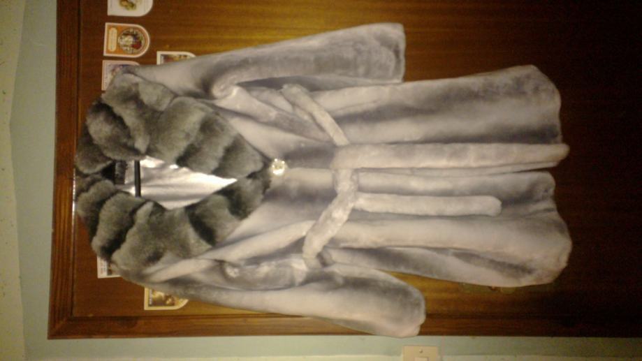 3. otmjena umjetna bunda, srebrna, meka, udobna i mucasta, do ispod koljena. Ako želite pljeniti pažnju prošetajte kroz grad u njoj ili obucite na neku svečanost. Ima jedan veliki gumb za kopčanje i otmjeni okovratnik. Samo za dame!!
