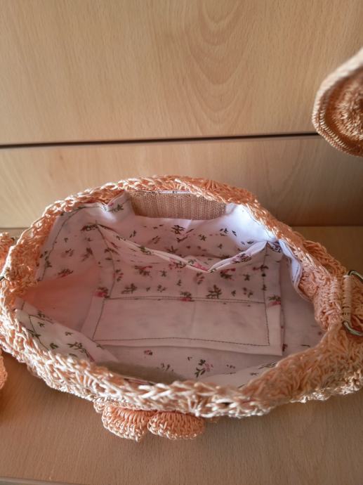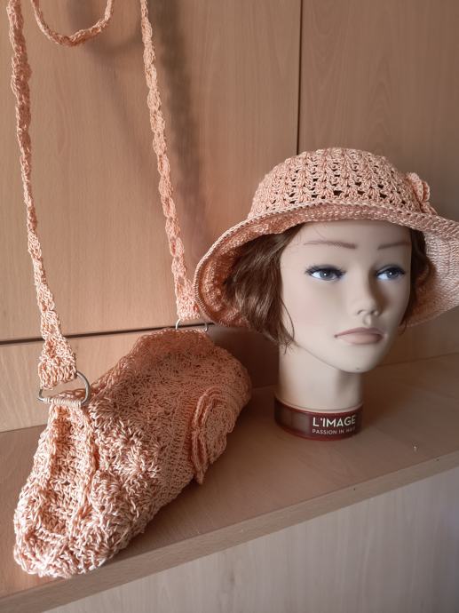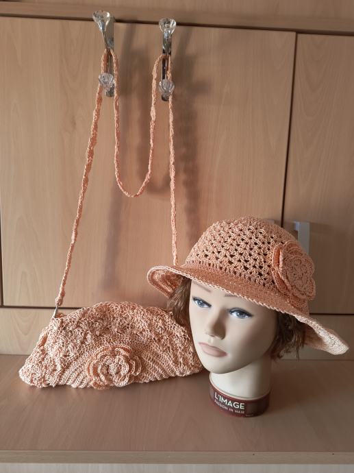 Ručno heklana torbica, podstavljena i šešir u obodu žica od čistog pamuka boje breskve.
