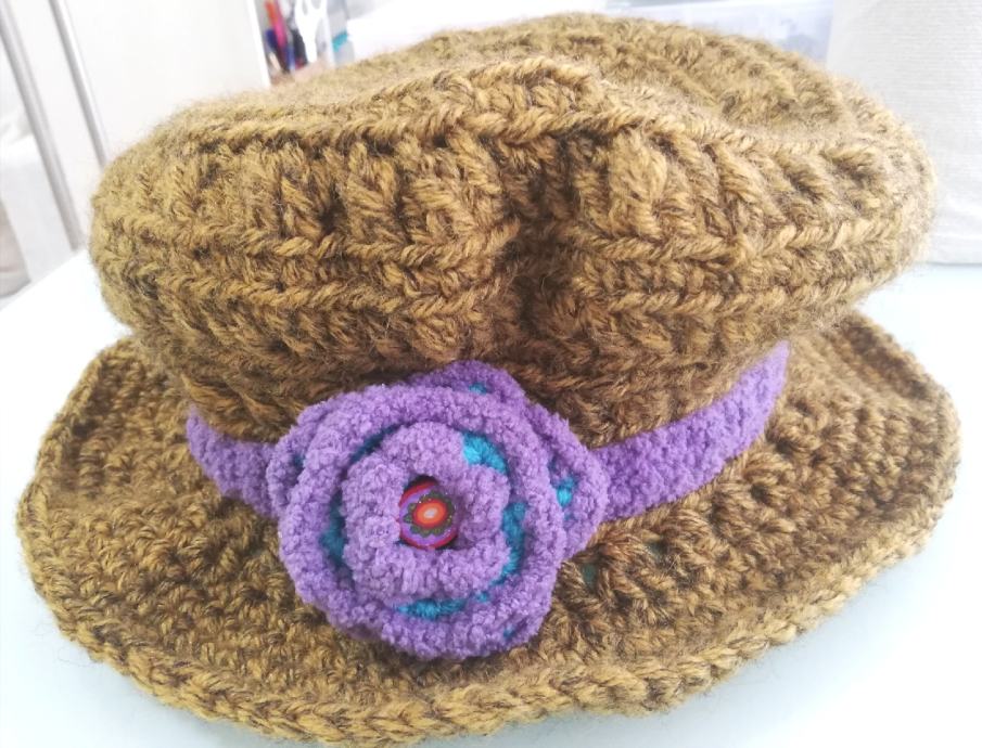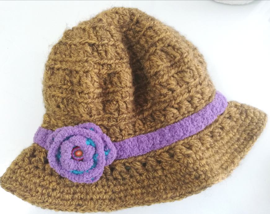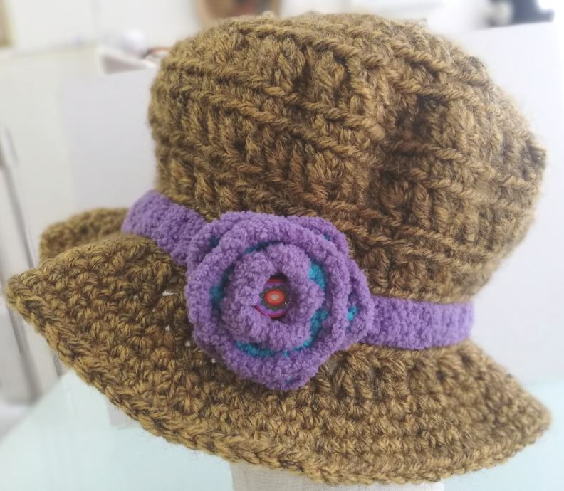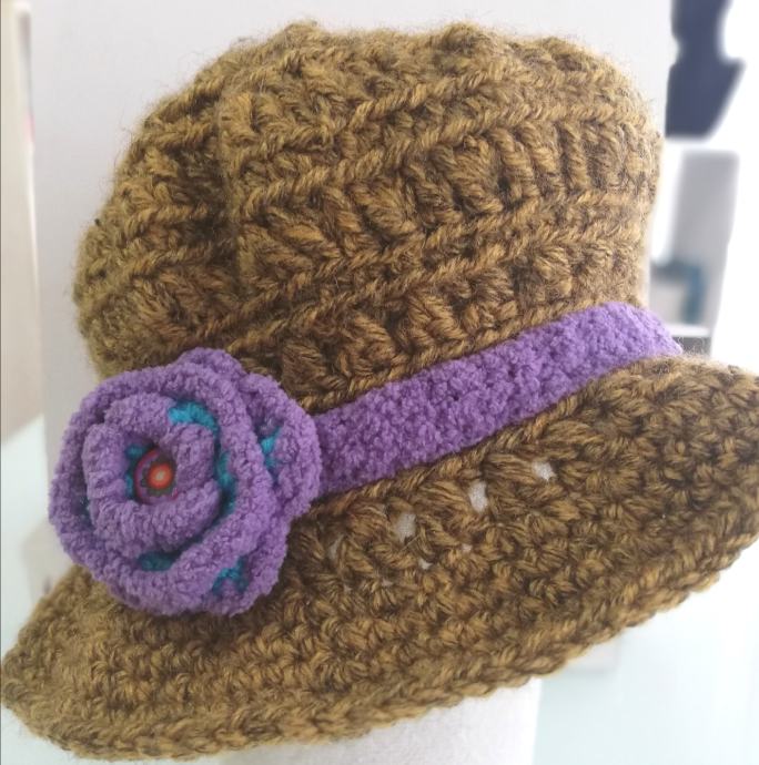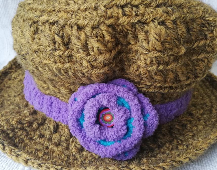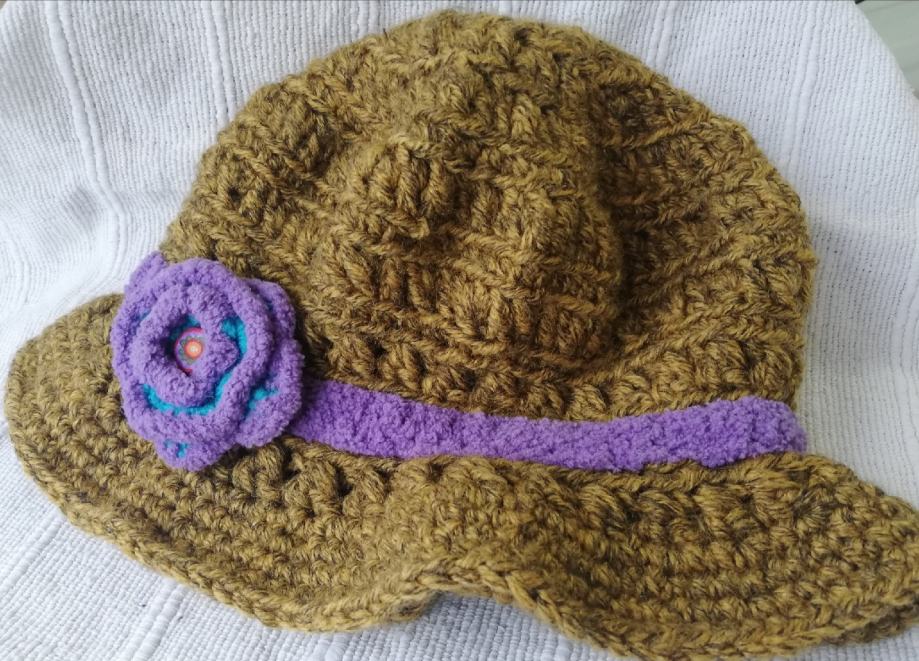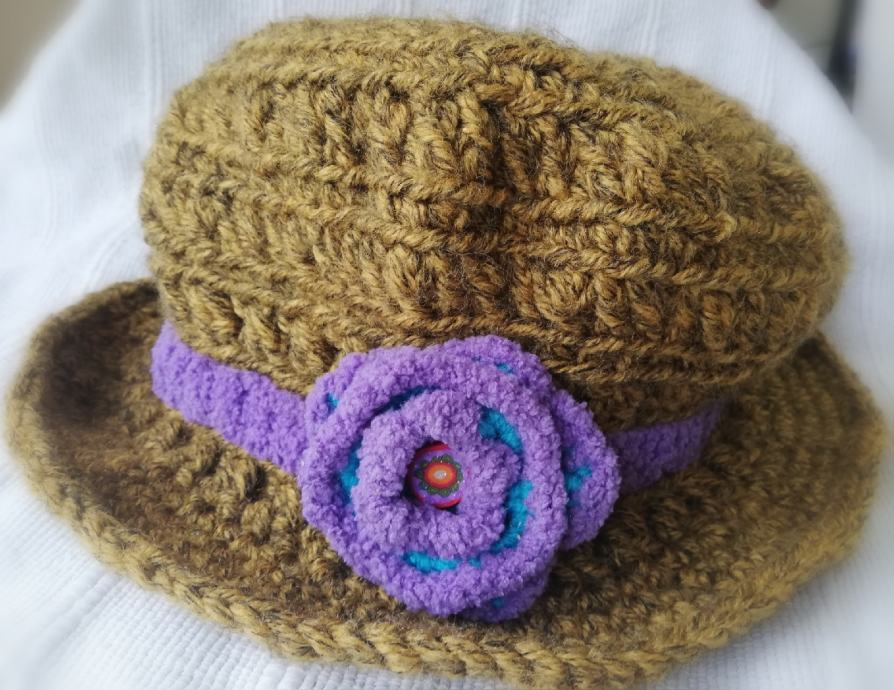 Predivan, topli šešir, heklan zelenkasto žutom vunom. Šeširić je ukrašen brošićem koji je također unikatan. Brošić cvijetnog motiva ukrasen je sarenom perlicom od polimerne gline. Ručni rad, unikat.