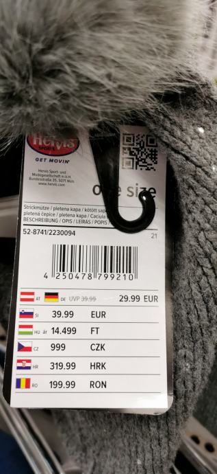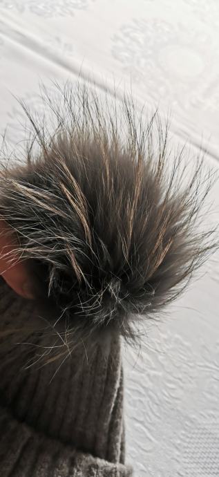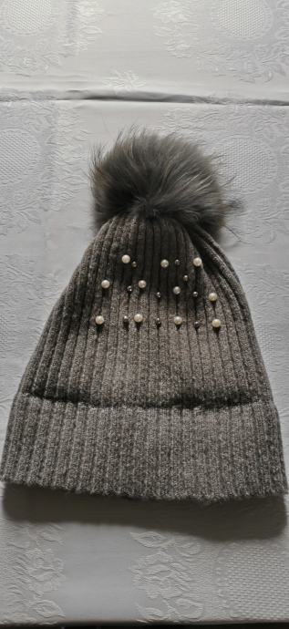 Nova siva pletena kapa sa biserima i velikim coflekom od pravog krzna.