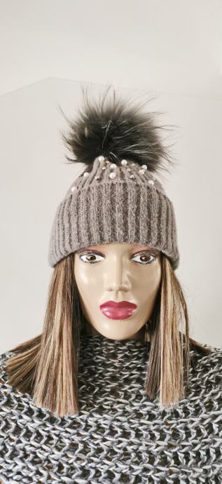 Nova siva pletena kapa sa biserima i velikim coflekom od pravog krzna