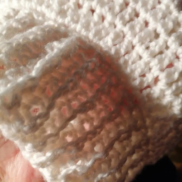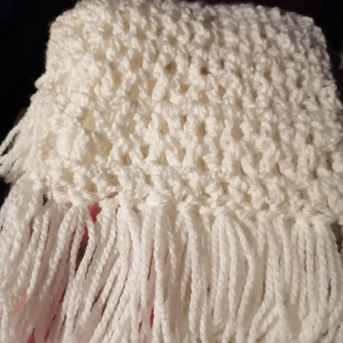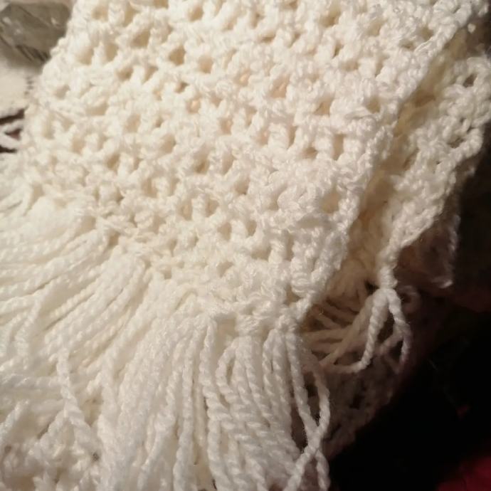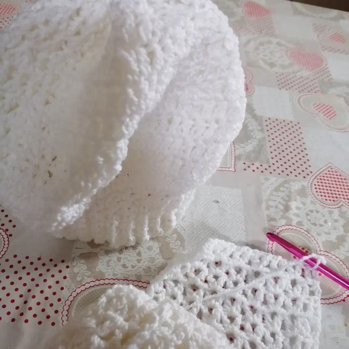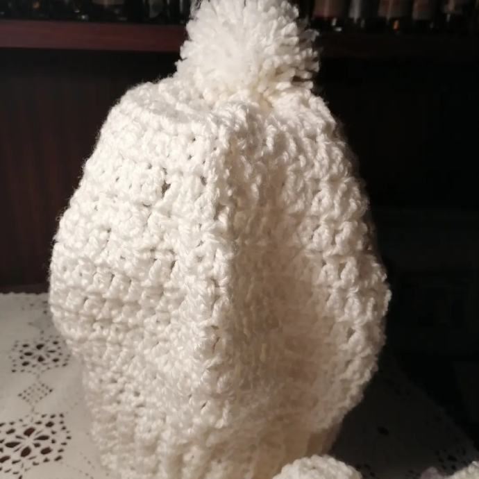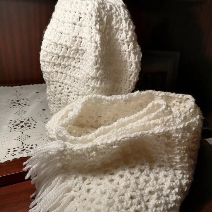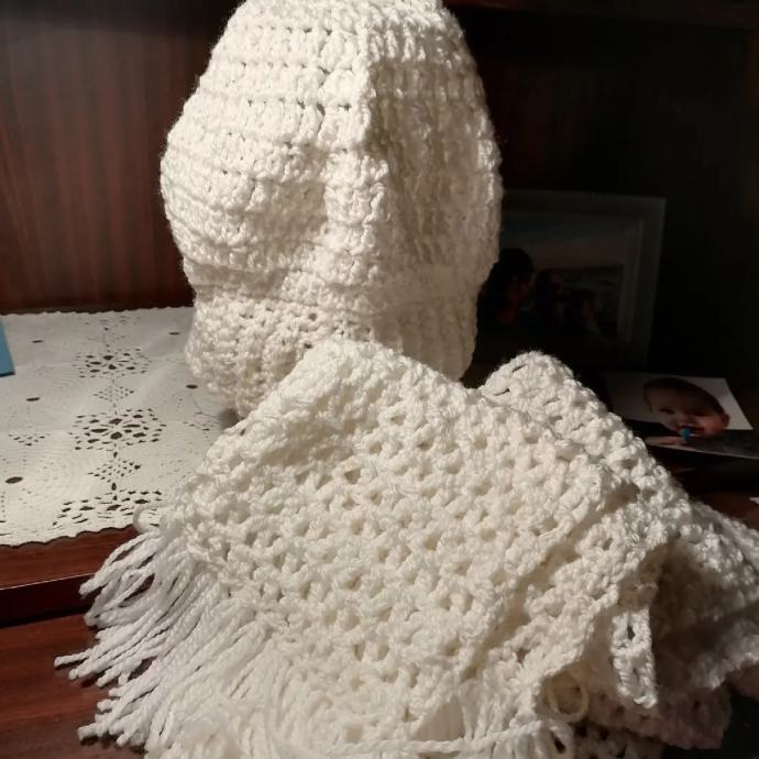 Rucno kukicana kapa i sal dug 2m, 15cm sirok, od mekane bijele vune u kompletu