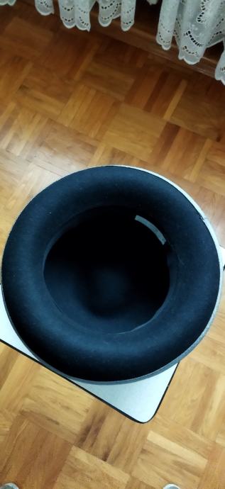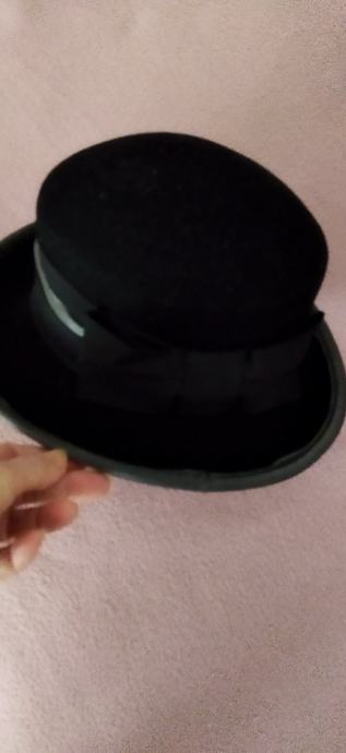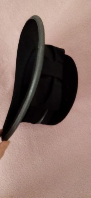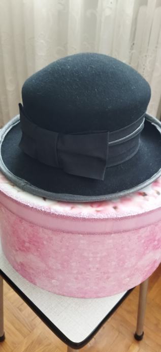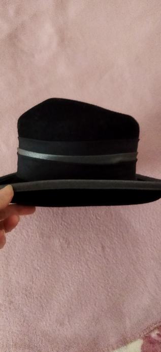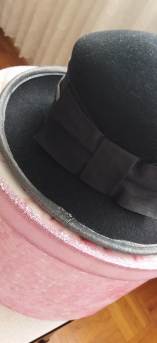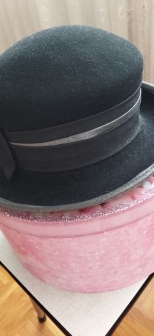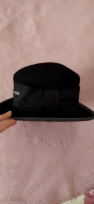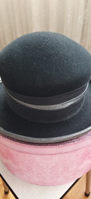Lijep crni šešir,100%vuna,unutarnji opseg 56cm,dublji.Samo ponekad nošen,kao nov.Ima tamno sivi obrub i odostraga crnu mašnu.Kupljen u Grazu,made in Italy