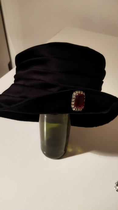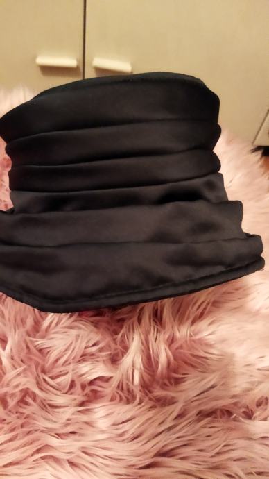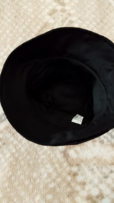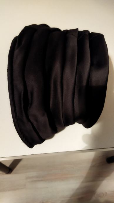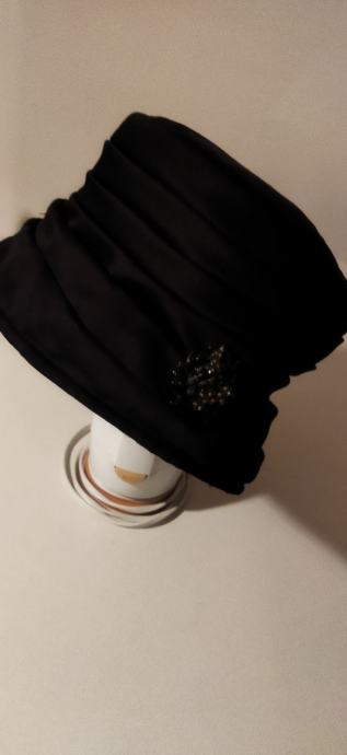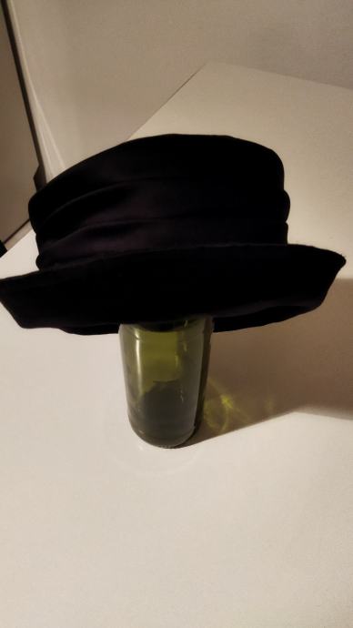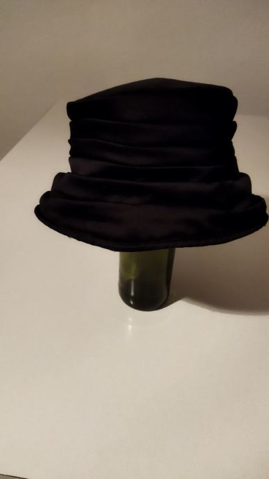 Šešir ženski,crne boje,lagan, s podstavom,100%polyester, made in Italy.Zanimljivo modeliran,nafaldan,obod šešira se može podesiti na kraće,jer je podatan,kao na slici.Unutarnji opseg kružno je 56cm,dubina od dna do obruba je 9cm,a od dna do vrha oboda tj do ruba šešira je 16 cm.