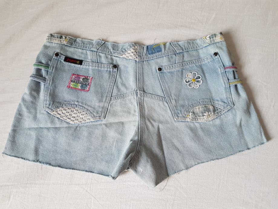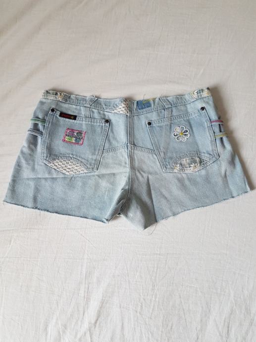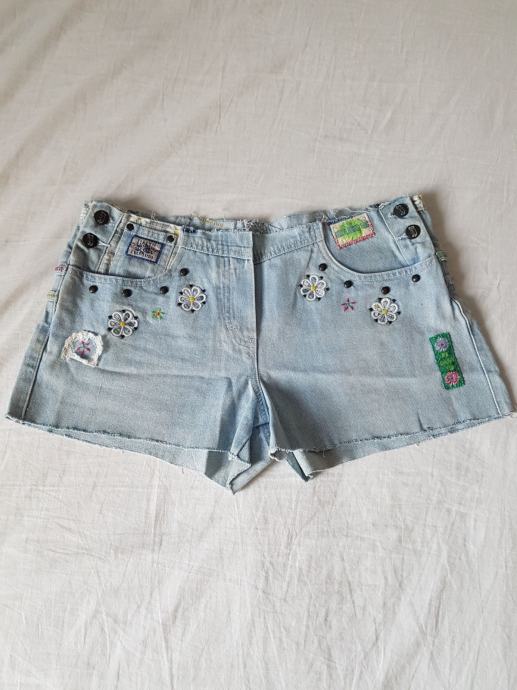 Kratke jeans (teksas) hlače, pamučne, nošene malo, očuvane. Imaju zanimljive uzorke na sebi. Kopčaju se sa strane (vidi se dugmad na slikama), tako da nema sprijeda šlic. Veličina između M/L.