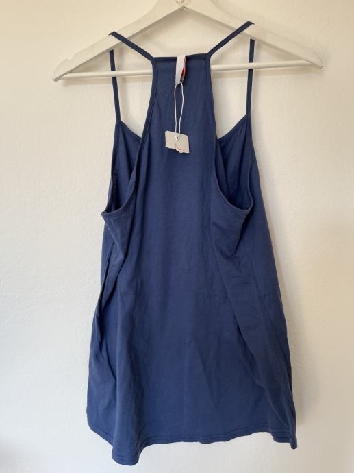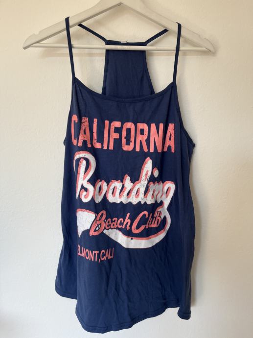 Prodajem lagani ženski top bez rukava u tamnoplavoj boji s upečatljivim narančasto-bijelim retro natpisom "California Boarding Beach Club". Majica ima tanke naramenice i "racerback" kroj na leđima, što je čini vrlo udobnom za ljetne vrućine.