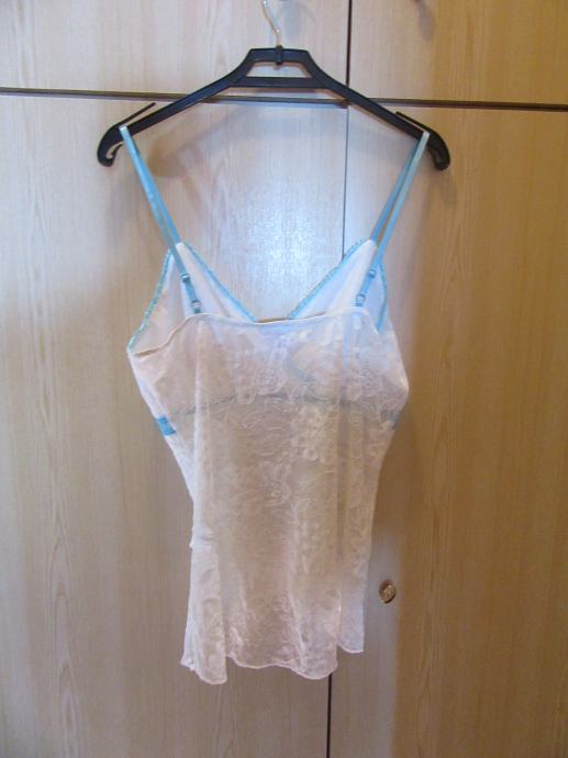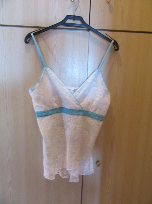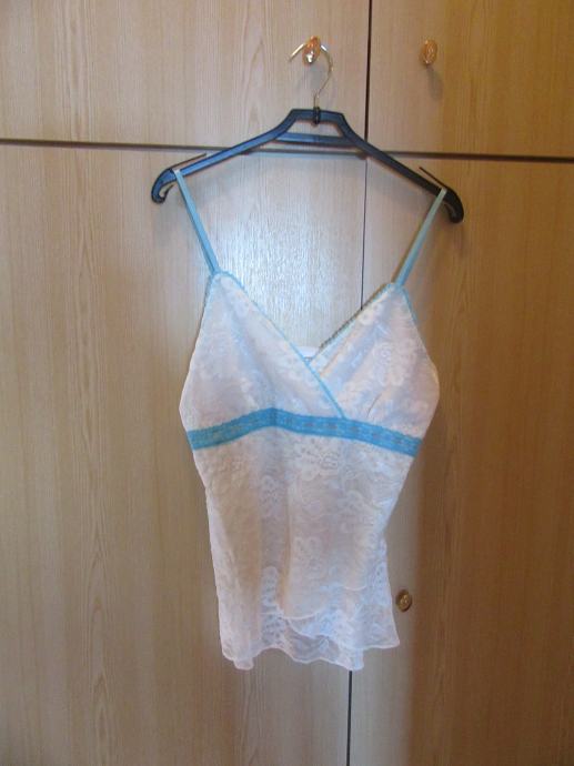Bijelo plavu majicu na čipku prodajem za 1€ + poštarina. Materijal je poliester i elastin. Veličina L. Dužina majice: 47 cm. Širina kod prsa: 36 cm. Širina na dnu: 36 cm Kontakt: bmoon76622@gmail.com