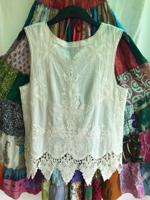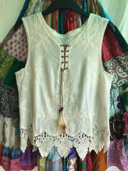 Čipkasta majica prljavobijele prema bež boje, lagano prozirna.