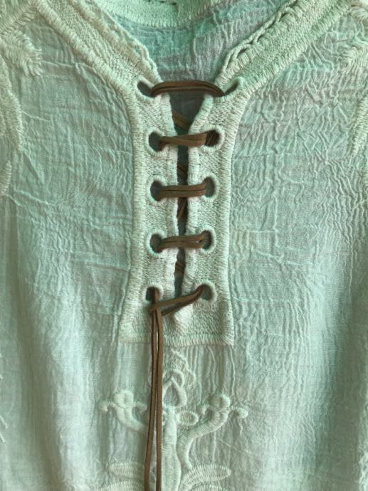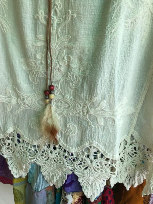 Izvezeni detalji s čipkastim rubom. Ima detalje s perjem i perlicama na vezici.