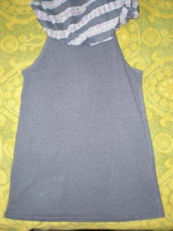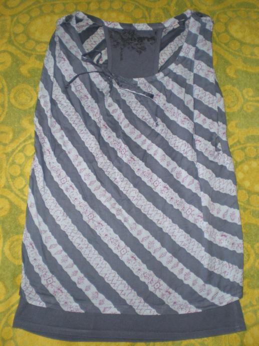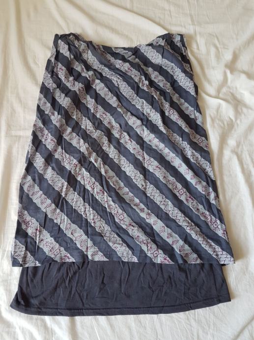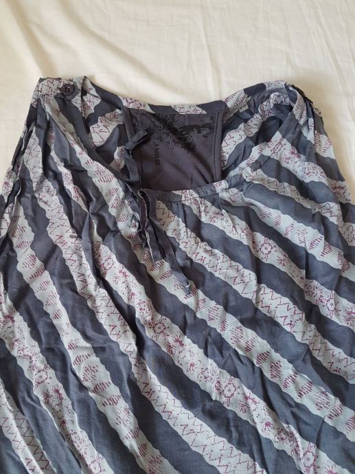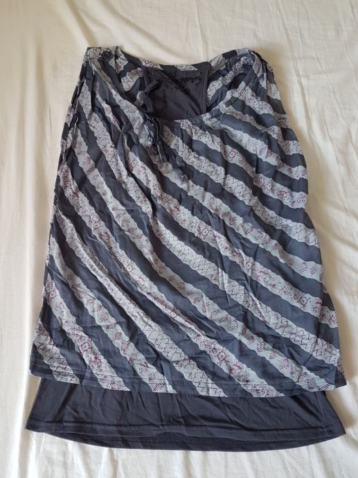 Sastoji se od 2 majice, jedna koja je ispod je tamnoplave boje uz tijelo, bez rukava, od viskoze i elastina pa je rastezljiva, a gornja je na plave lnije s ljubičastim uzorkom, pamučna. Jako lijepo stoji, lagana je. Veličina 38, M. Nošena malo, očuvana.