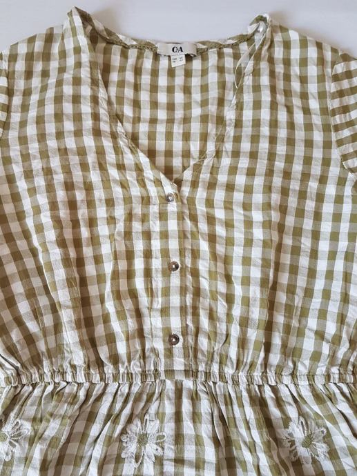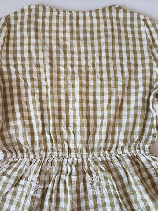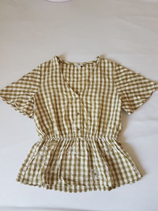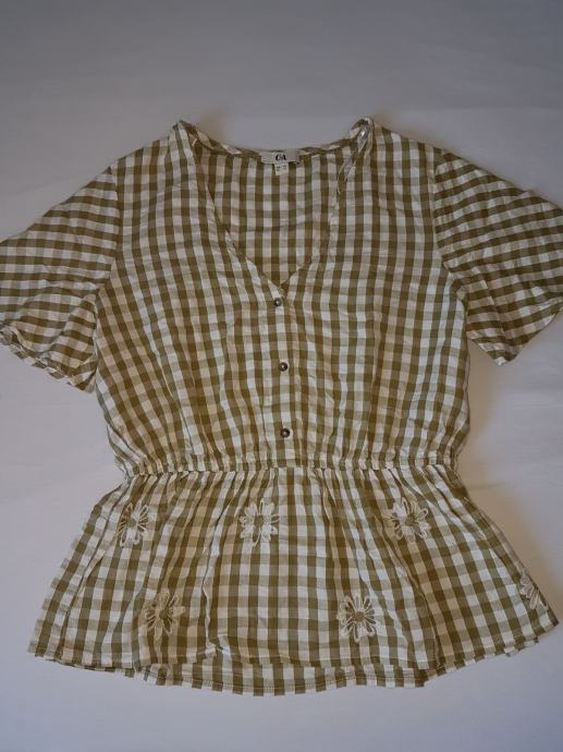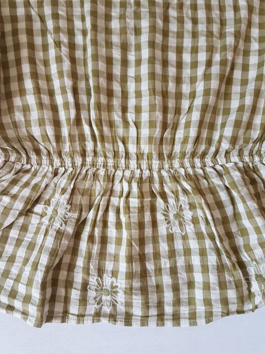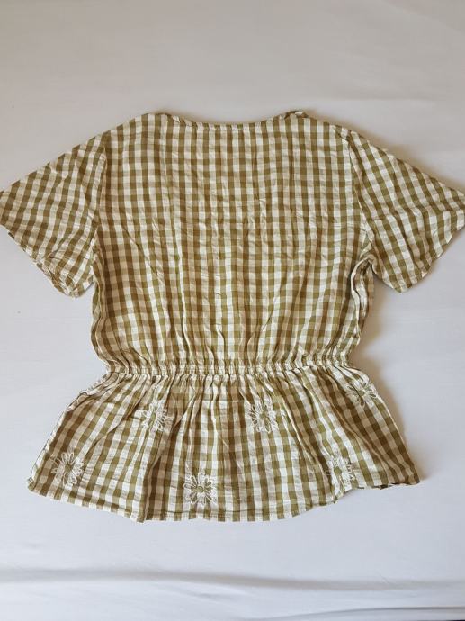 Potpuno nova C&A majica, skinuta etiketa i jednom oprana nikada nošena. Pamučna, lagana, ugodna za nositi. U struku ima gumicu te je rastezljiva. Karirani uzorak zeleno bijele boje sa nekoliko cvjetića izvezenih.