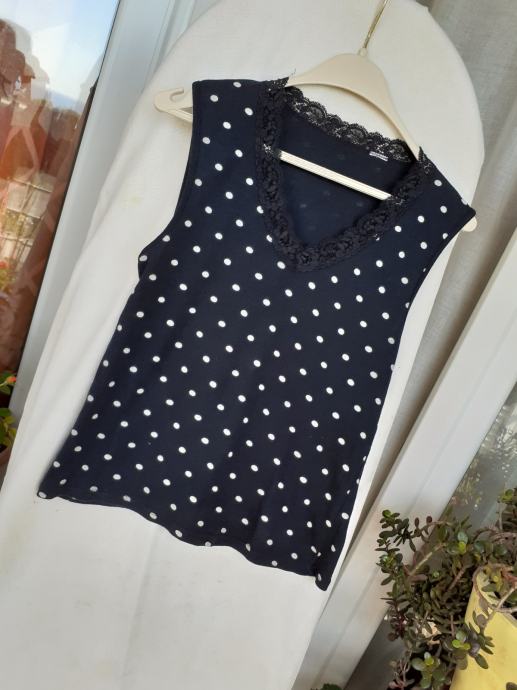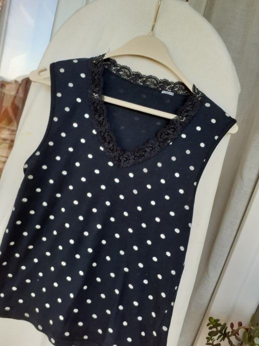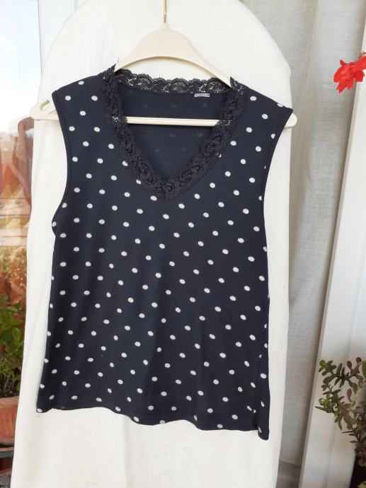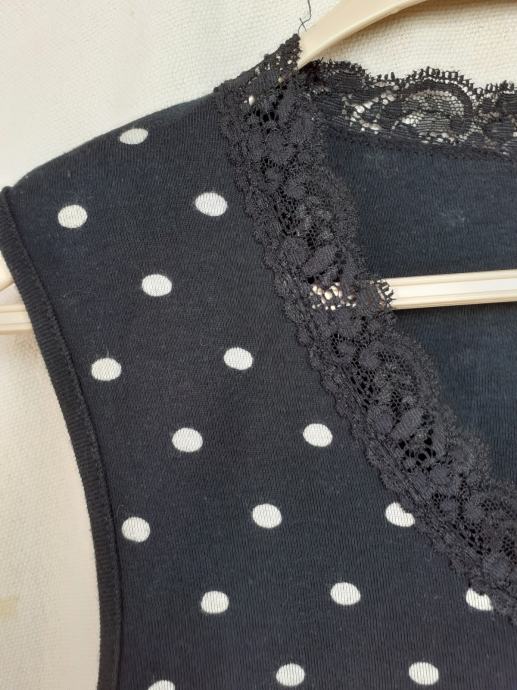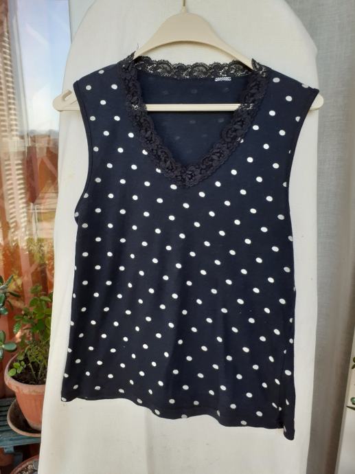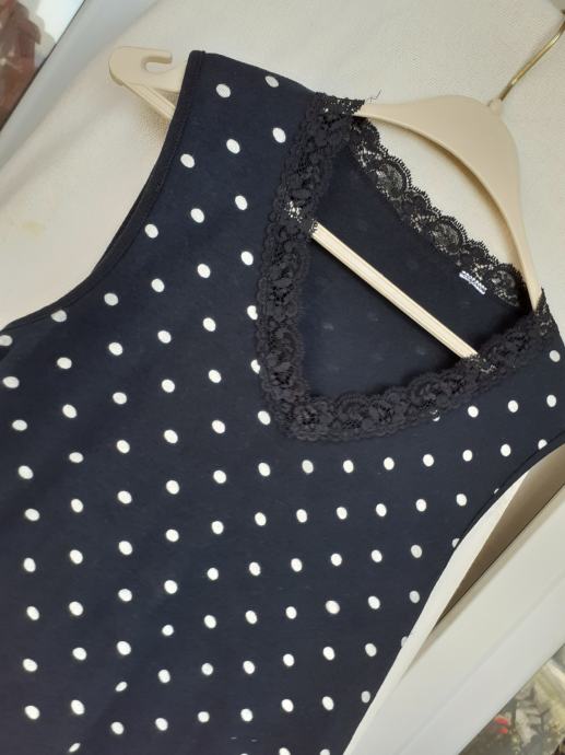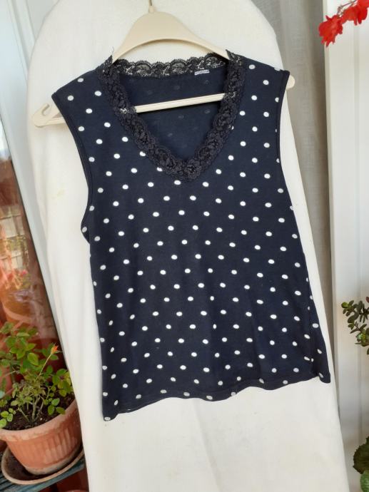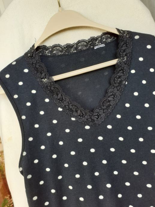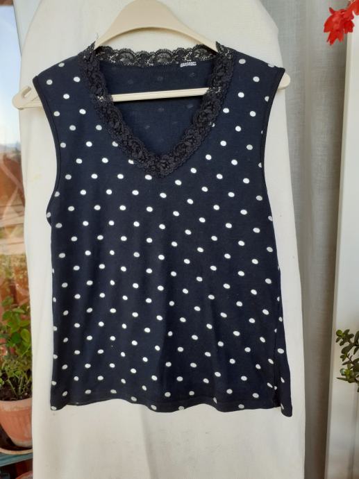 Prozračna pletena, tanka, ljetna, pamučna majica na točke, top, bez rukava, sa ukrasnom čipkom, elastična. bez greške, postojane boje. Boja je vjerna, slikano na danjem svjetlu. Širina ramena od pazuha do pazuha 42, dužina od pazuha do ruba 34, dužina od vratnog izreza iza do ruba 54. Mjere su bez istezanja.