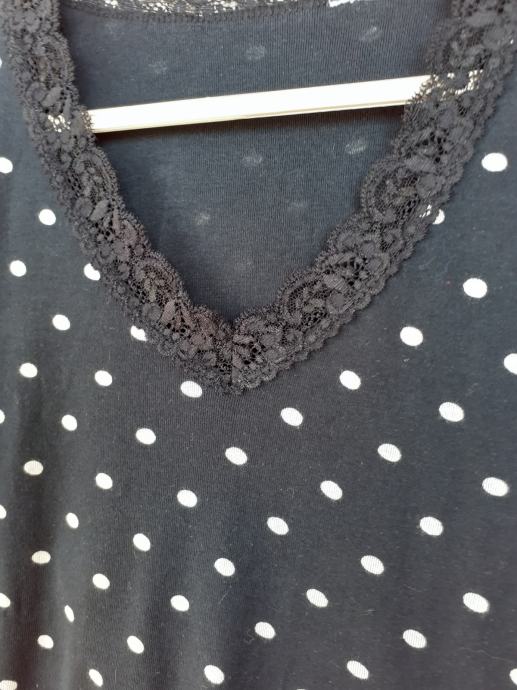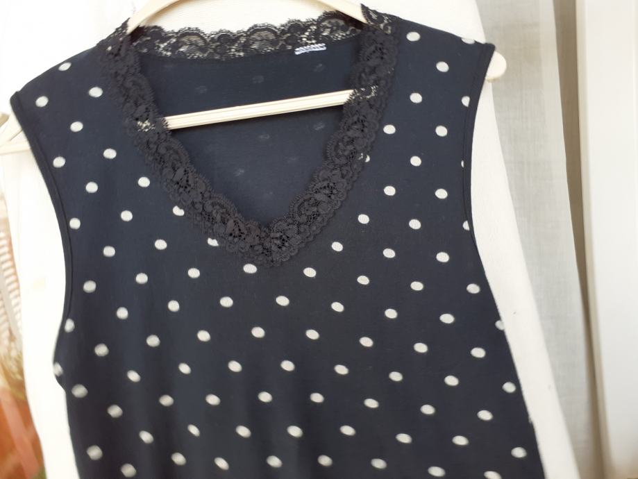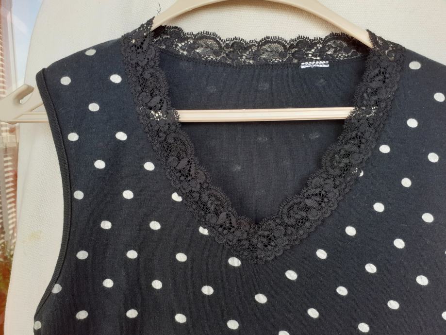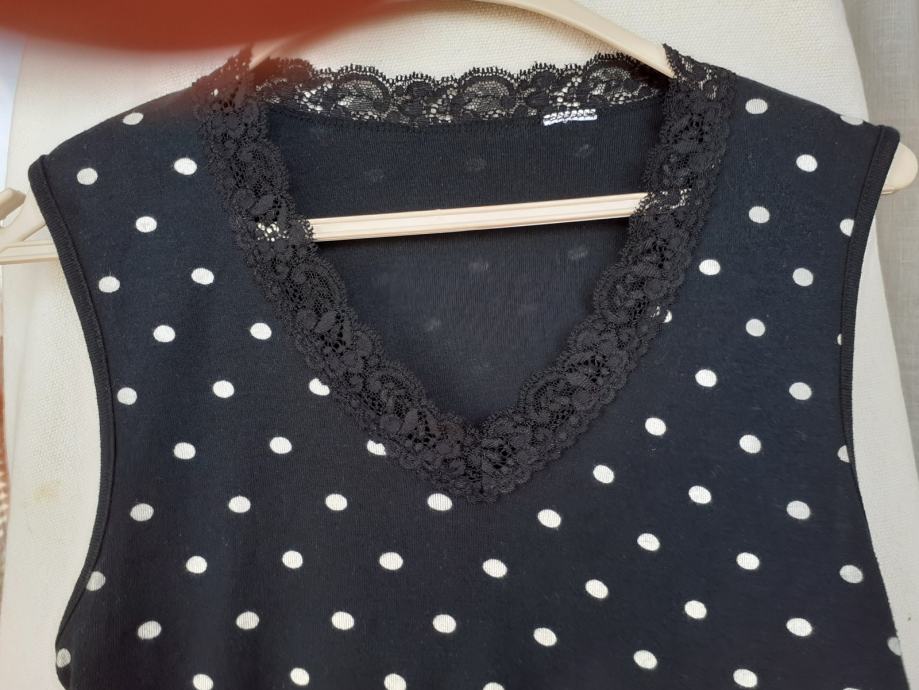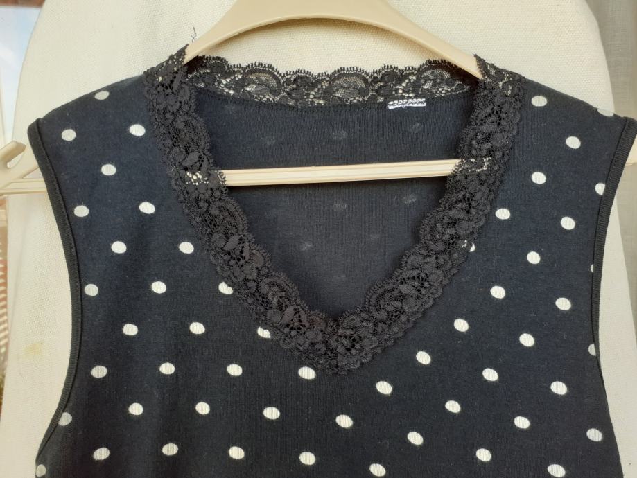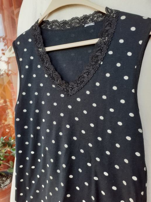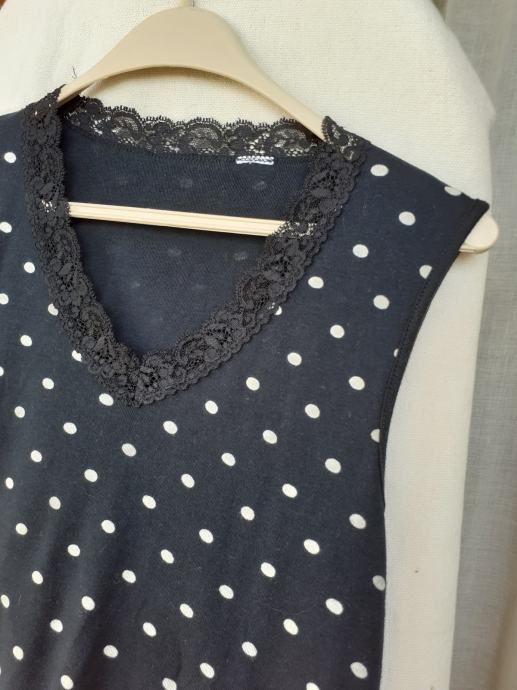 Prozračna pletena, tanka, ljetna, pamučna majica na točke, top, bez rukava, sa ukrasnom čipkom, elastična. bez greške, postojane boje. Boja je vjerna, slikano na danjem svjetlu. Širina ramena od pazuha do pazuha 42, dužina od pazuha do ruba 34, dužina od vratnog izreza iza do ruba 54. Mjere su bez istezanja.