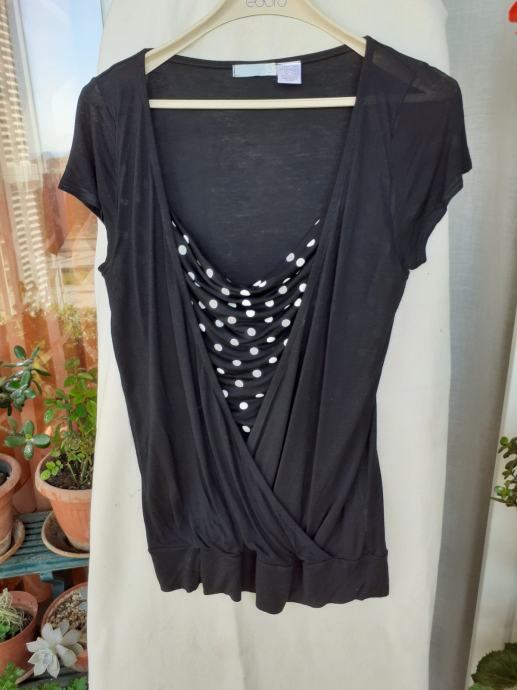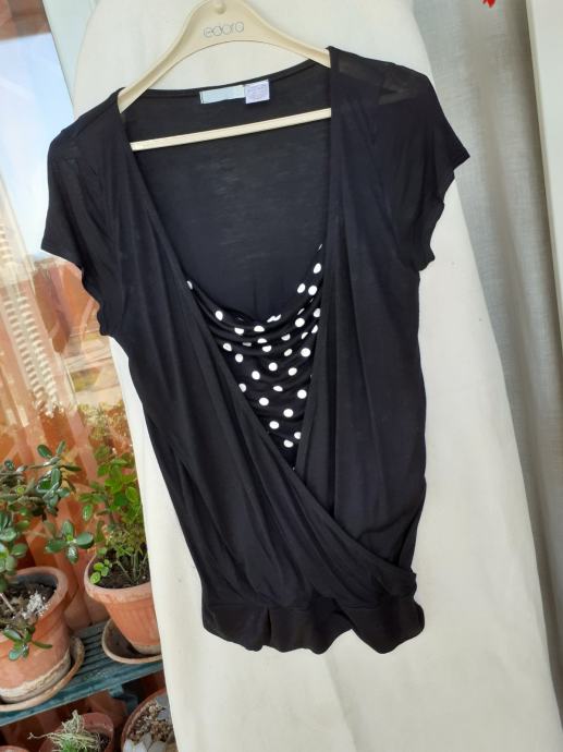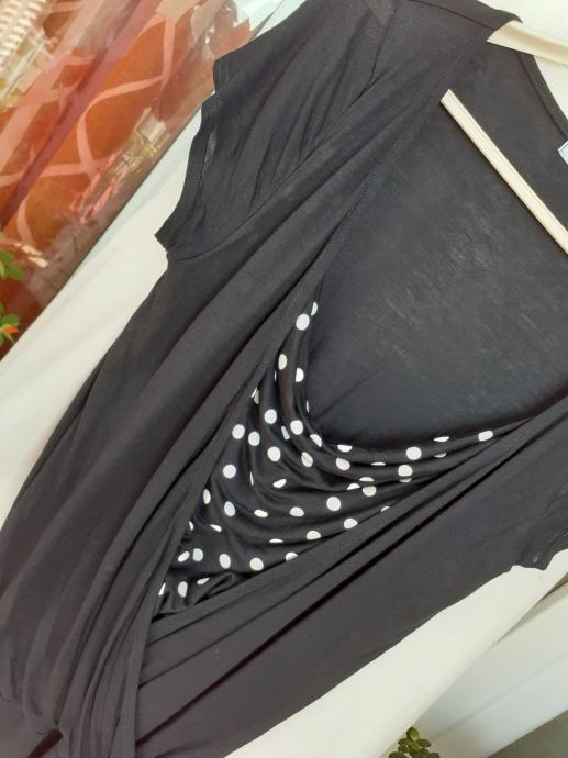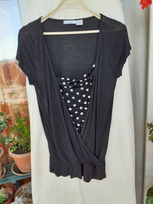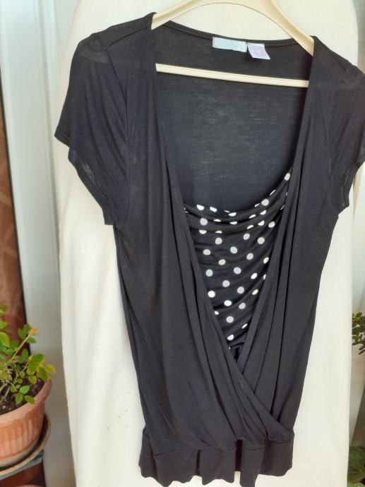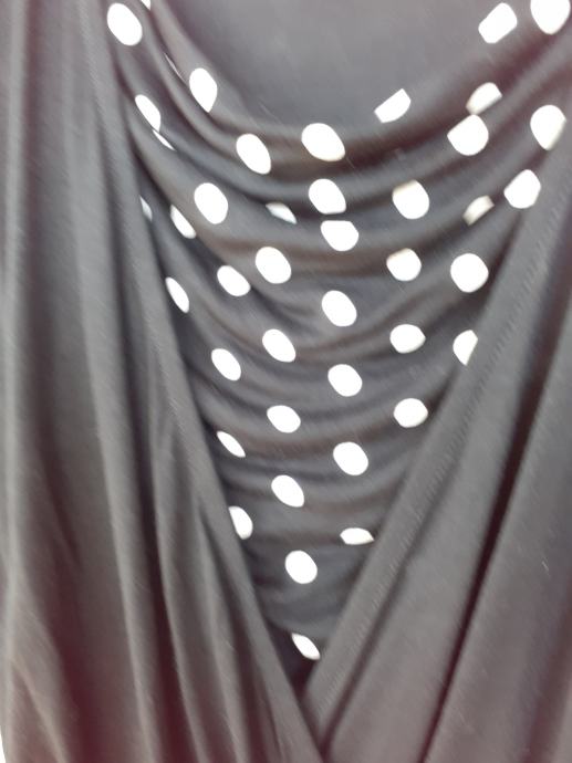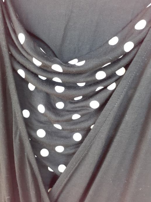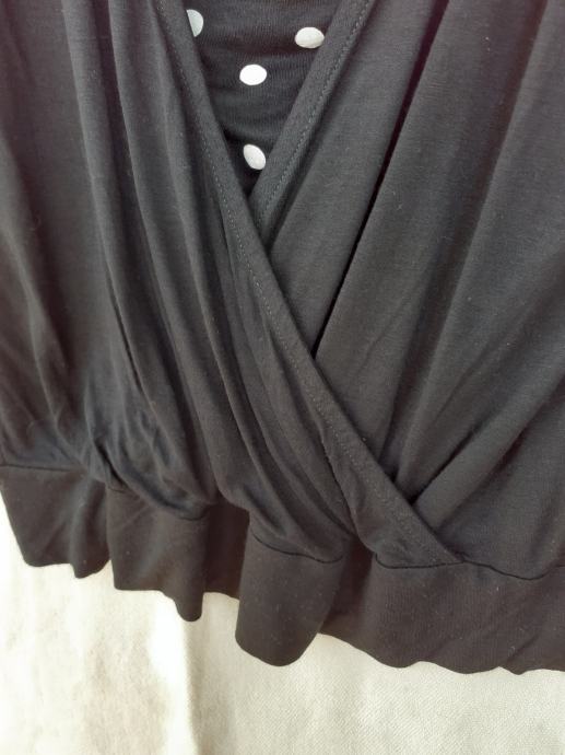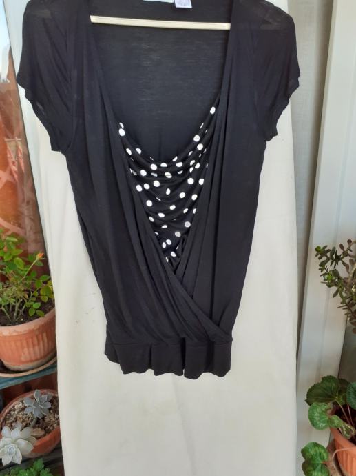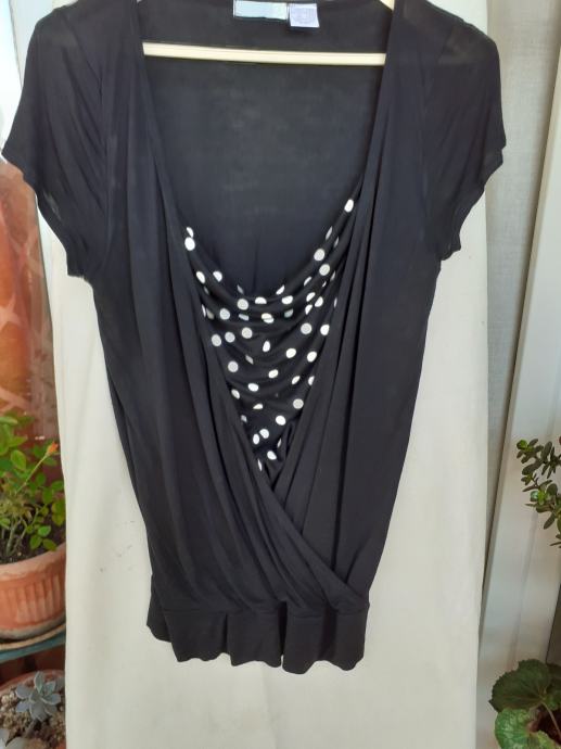 Prozračna pletena majica-tunika od tankog materijala, koji ugodno hladi, sa umetnutim dijelom na bijele točkice, koji lijepo ukrašava vratni izrez. Mali kratki rukavi, a pri dnu "padajući" materijal je lagano nabran sa pasicom. Dužina je približno preko bokova, može se nositi na suknje i hlače, casual ili svečana, po želji, bez greške, postojane boje. Boja je vjerna, slikano na danjem svjetlu.