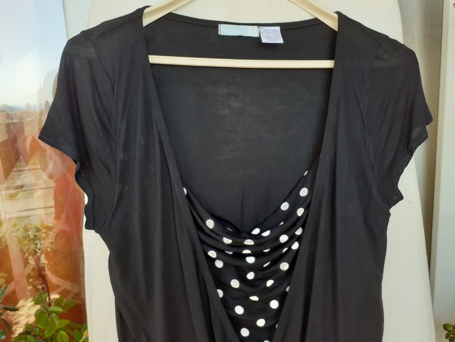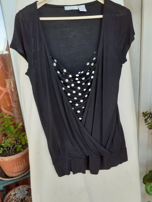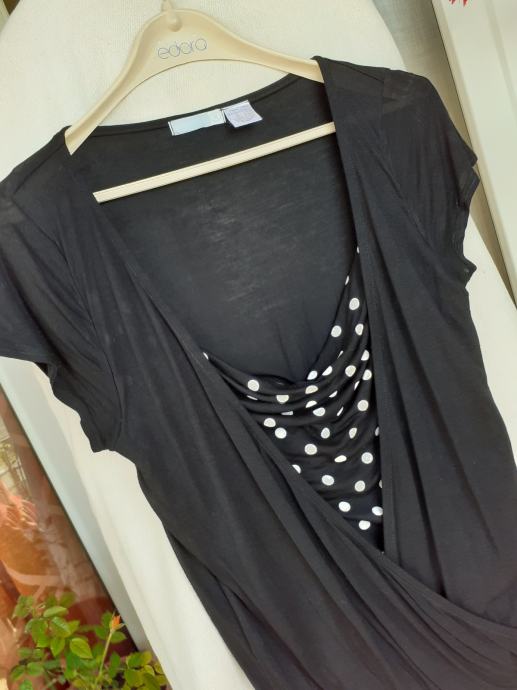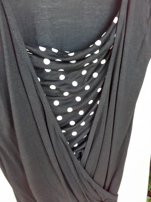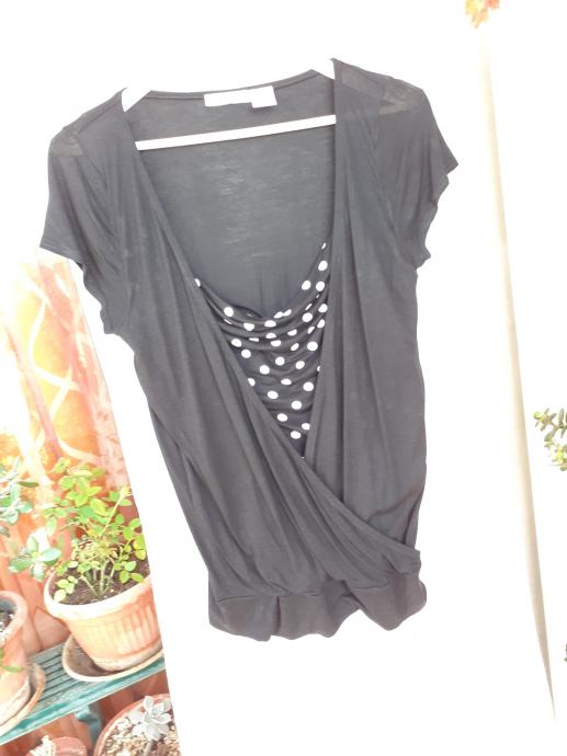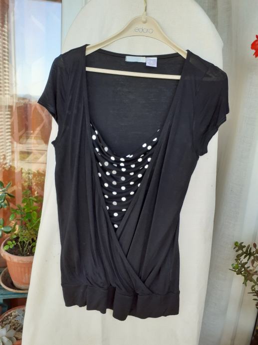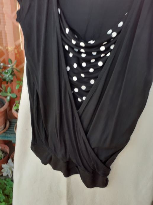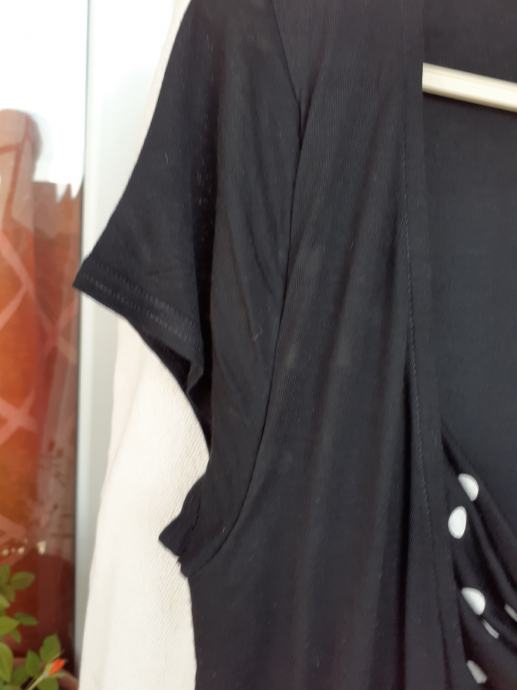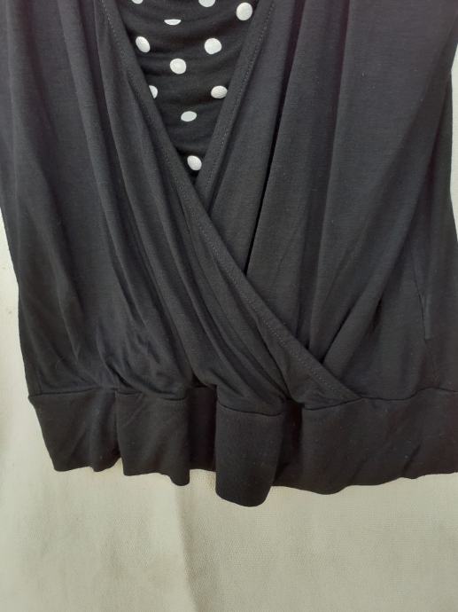 Prozračna pletena majica-tunika od tankog materijala, koji ugodno hladi, sa umetnutim dijelom na bijele točkice, koji lijepo ukrašava vratni izrez. Mali kratki rukavi, a pri dnu "padajući" materijal je lagano nabran sa pasicom. Dužina je približno preko bokova, može se nositi na suknje i hlače, casual ili svečana, po želji, bez greške, postojane boje. Boja je vjerna, slikano na danjem svjetlu.