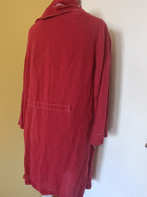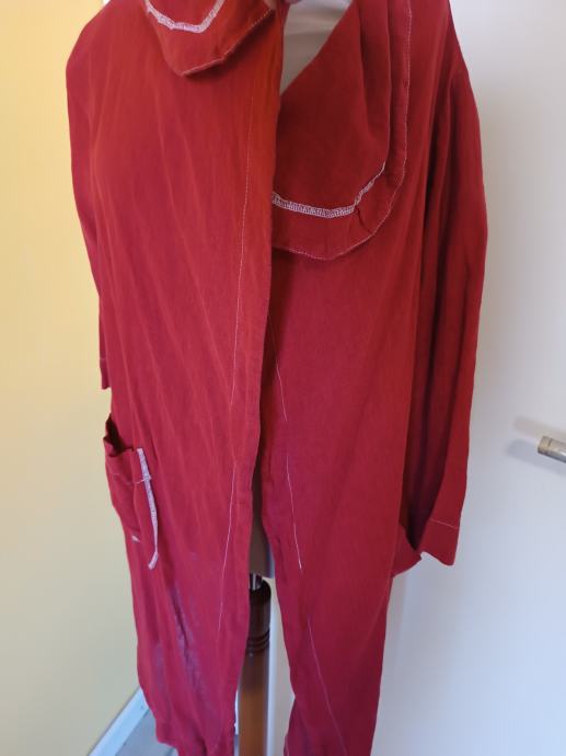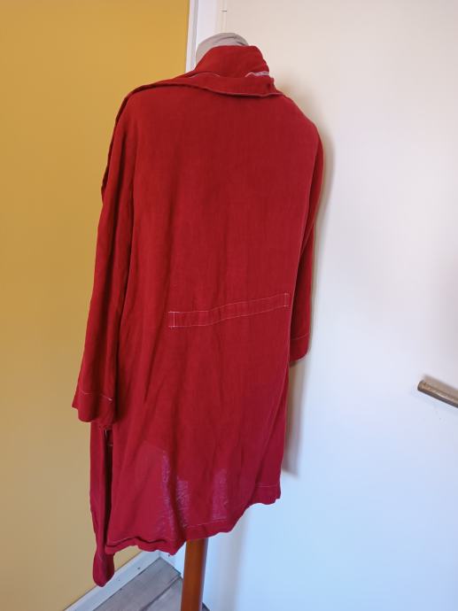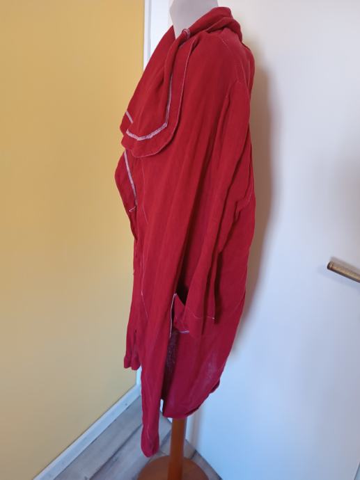 Crveni kardigan s velikim ovratnikom, otvorenim prednjim dijelom, džepovima i bijelim obrubom. Iza ima mjesto gdje se može staviti bijela ili crvena traka i tako zavezati ovaj neobičan kardigan. Opuštenoga kroja, upečatljivog izgleda.