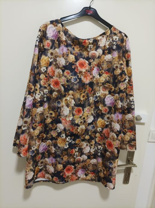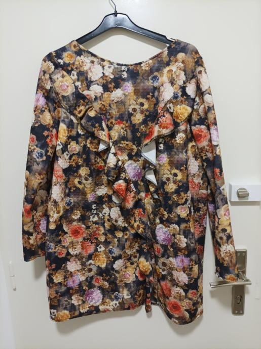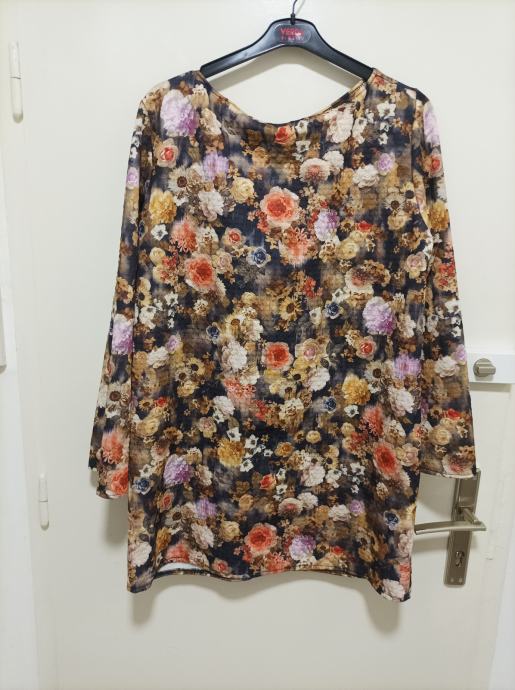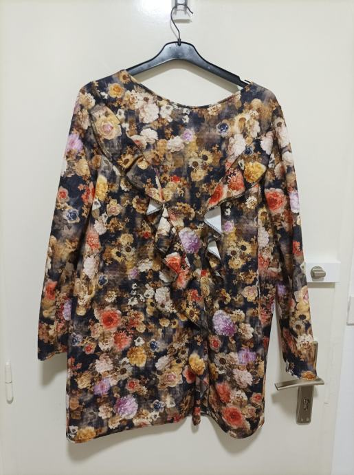 Zanimljiva tunika prepuna raznovrsnog i raznobojnog cvijeća. Cijelom duljinom je i volan. Odlično na tamne hlače. Ravni model.
