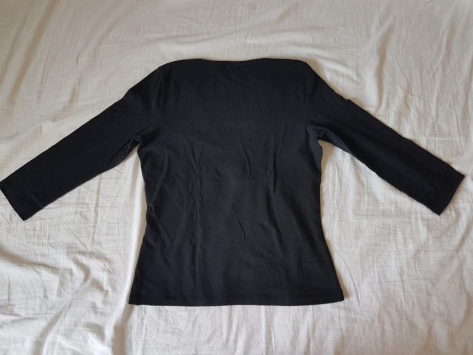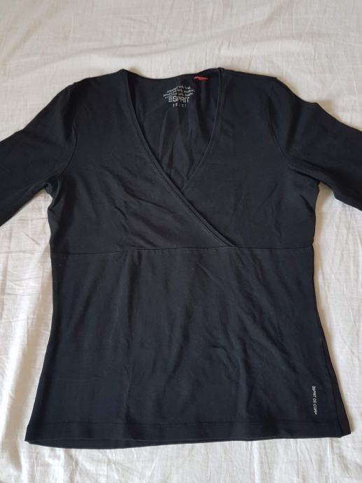 Esprit majica, crne boje, sa većim izrezom tj. dekolteom (najbolje obući ispod nje majicu / potkošulju) te manjim preklopom. Strukirana uz tijelo, elastična. Rukavi su 3/4 dužine. Veličina M. Malo nošena, očuvana.