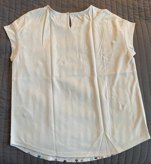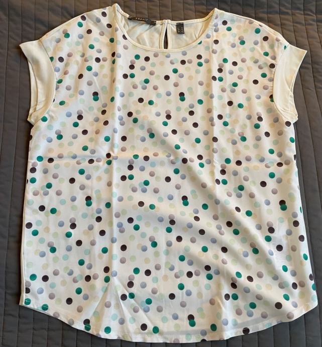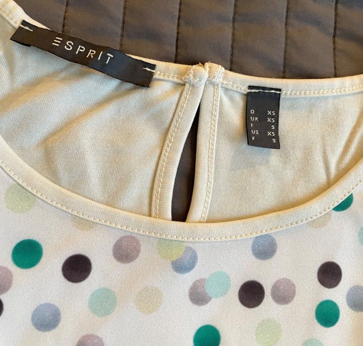 Prodajem Esprit top u veličini XS. S prednje strane je od poliestera s točkastim uzorkom, dok je stražnja strana jednobojna bež boje i napravljena od viskoze. Top je dosta komotan, širina u prsima je 100 cm, a duljina je 65 cm. Potpuno je nov, nikad obučen, samo su skinute etikete.