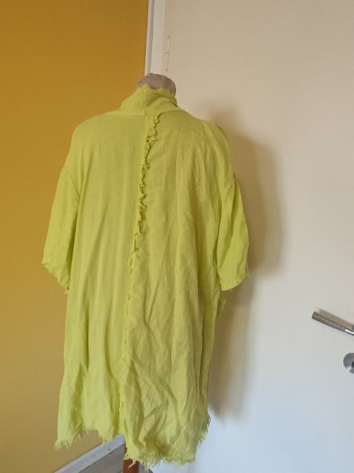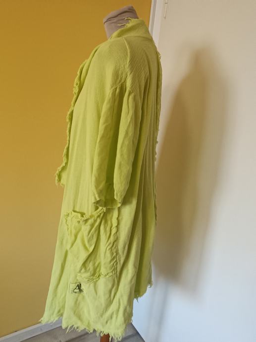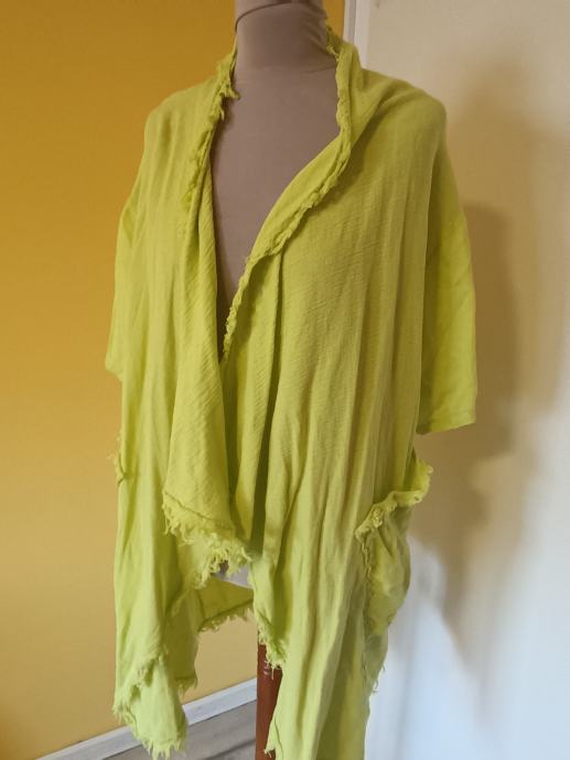 Oversize kardigan ili predimenzionirana jakna od mješavine lana i pamuka u boji limete s resicama. Otvoren prednji dio, ponešto asimetričan i kratki rukavi. Ležeran i boemski izgled.