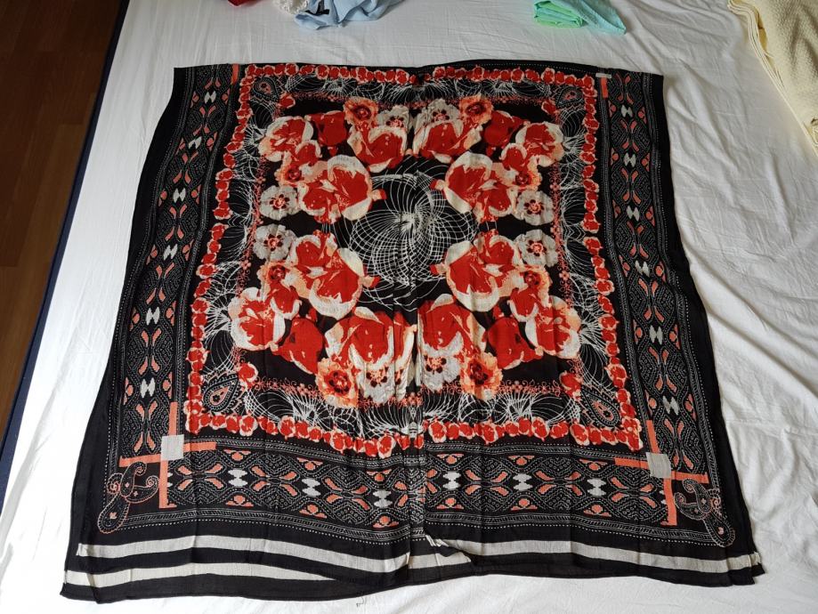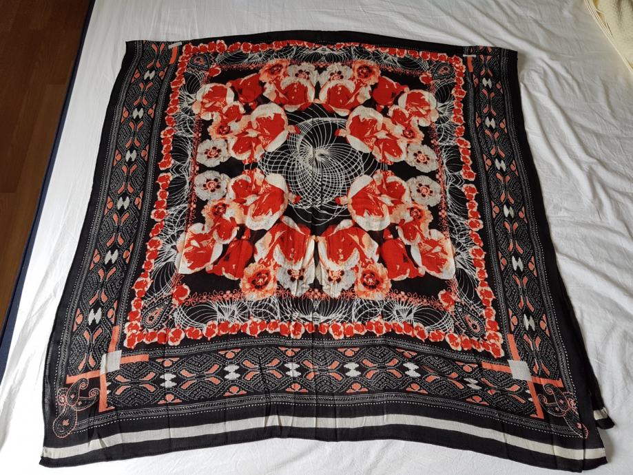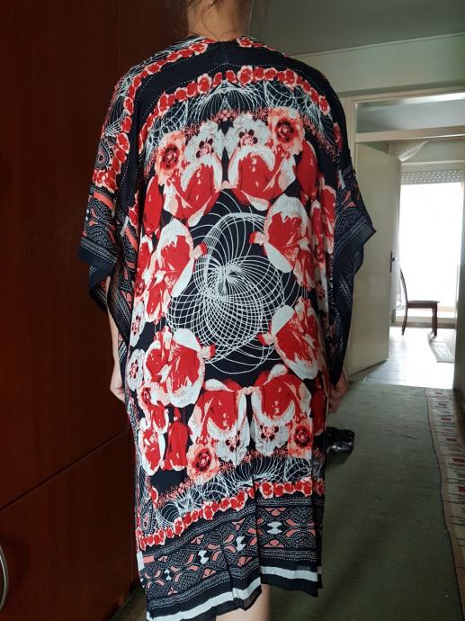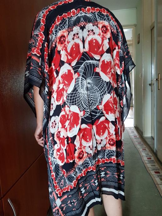 Potpuno novi i nenošeni ljetni lagani pončo marke Seed Heritage. Odličan za plažu i za ogrnuti se u večernjim satima. Prevladava crvena i crna boja. Na njemu piše univerzalna veličina, na slici osoba nosi L veličinu pa prema tome vjerojatnije stoji M i L veličini bolje. Materijal viskoza.