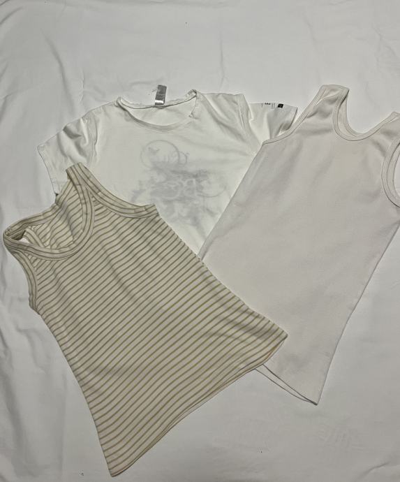 Bijele možda jednom nošene, prugasta dva do tri puta, bez oštećenja ili ičega. Bijela kratki rukav ima print vidi se na slici. Sve tri u kompletu za 3 €
