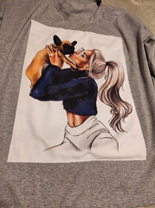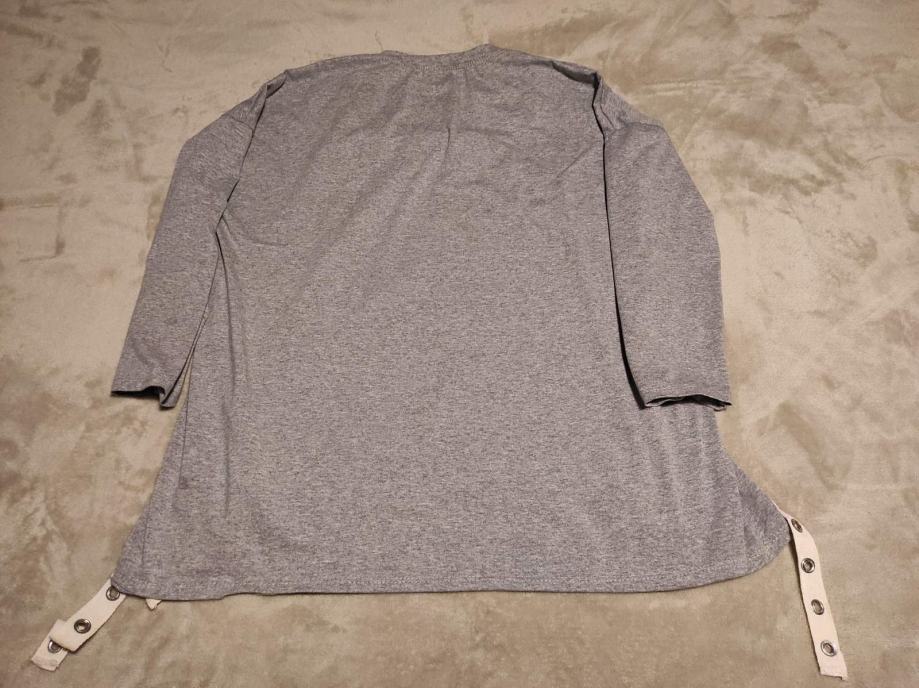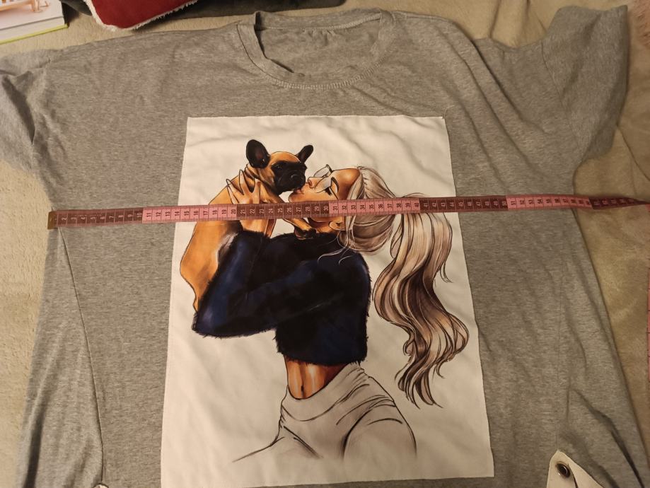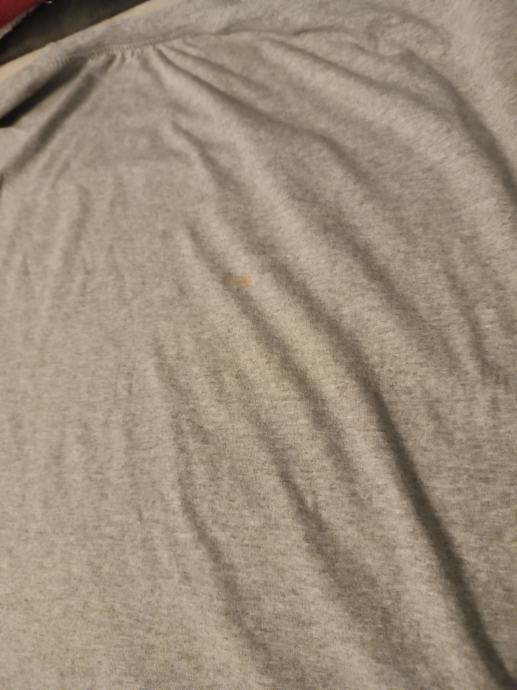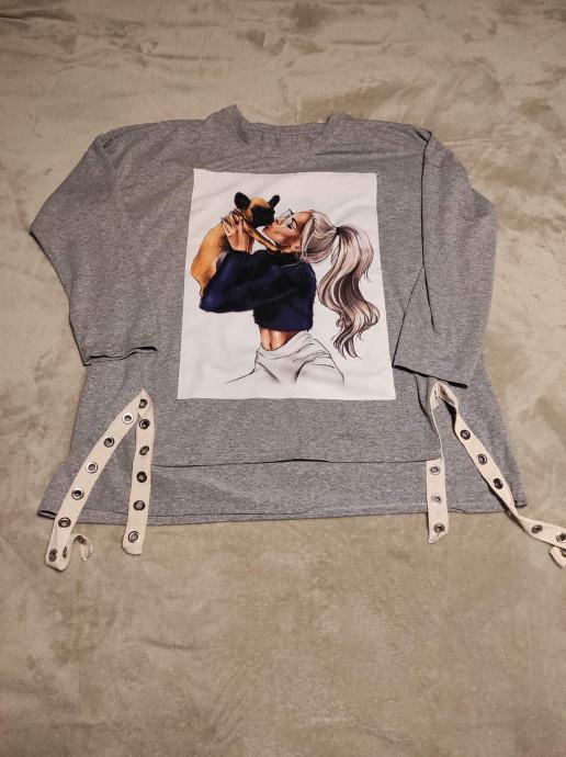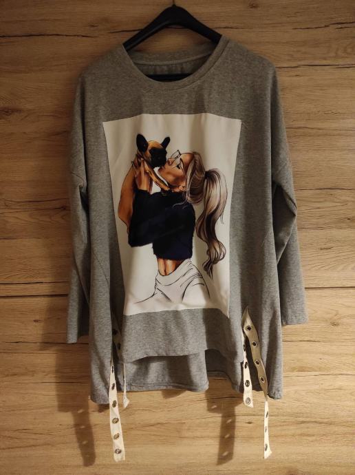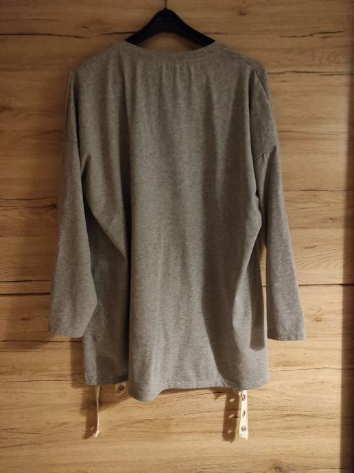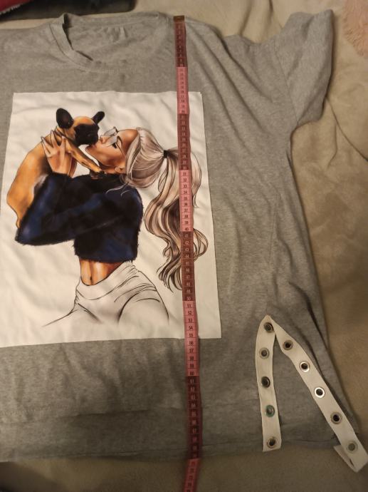 Duža majica s efektnim printom. Veličina ne piše, otprilike L. Širina je 58, dužina s prednje strane 64, sa stražnje 70, na slikama se vidi gdje je mjereno. Sa stražnje strane ima mrljicu, vidi se na zadnjoj slici, zato je cijena snižena. Pogledajte i ostale moje oglase, na više kupljenih stvari popust.