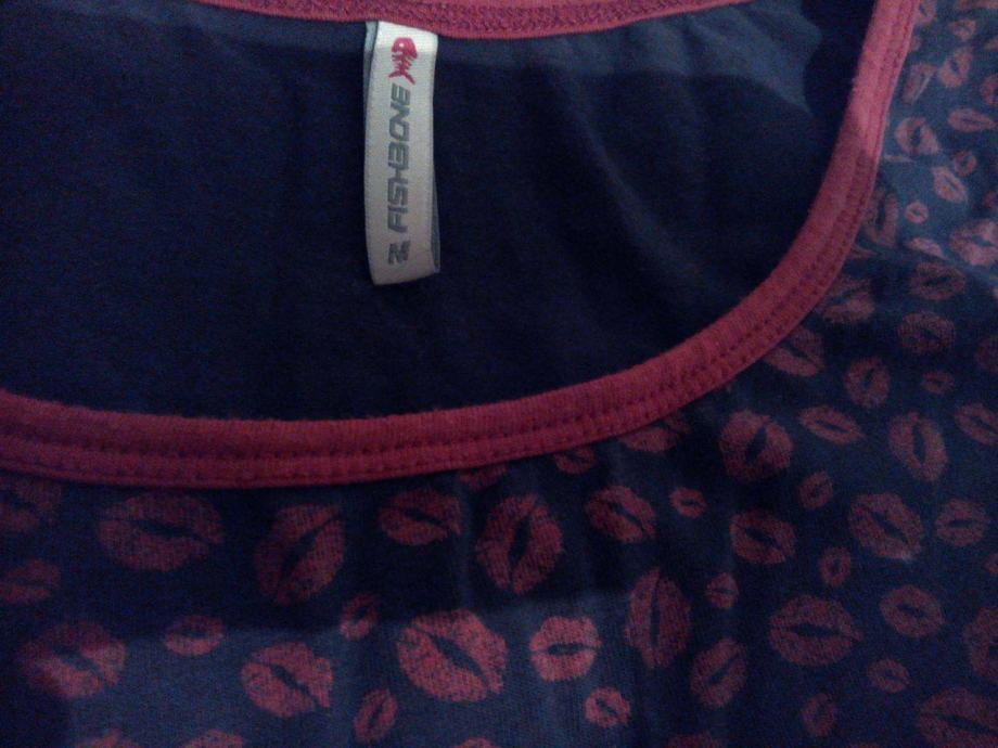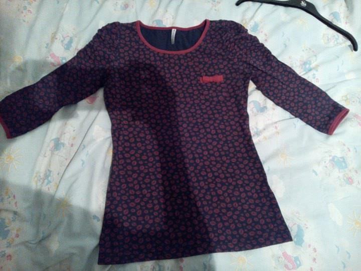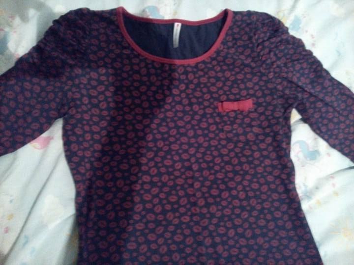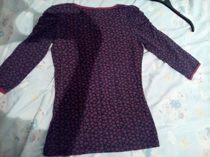 Majica na puse (usne), veličina S, okrugli izrez, tamno plave boje na bordo usne, ima naprijed malu masnicu, rastezljiva, jako udobna za nositi. Nosena par puta, ocuvana. 3/4 rukavi. Kupljena u New Yorkeru.