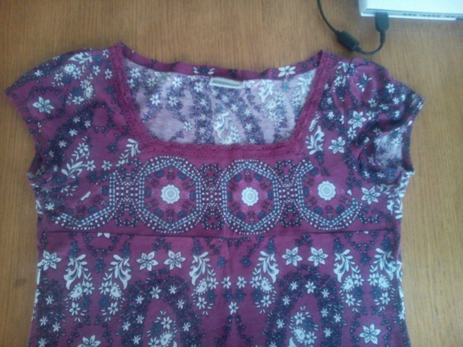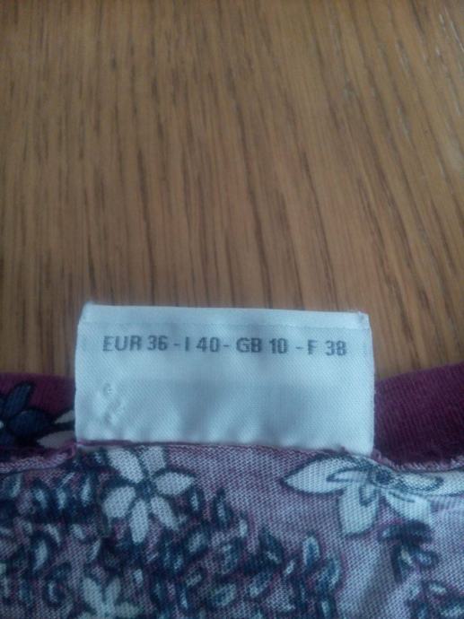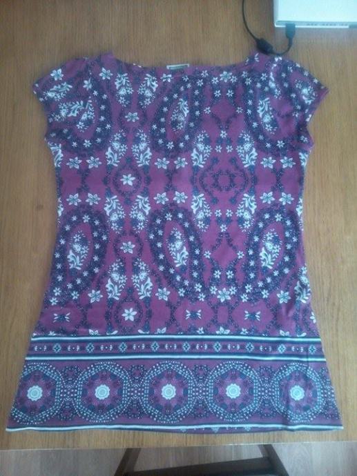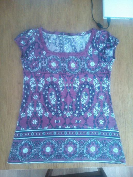 Majica sa uzorcima, veličina S/M,rastezljiva, ima čipkicu gore oko izreza, boje ljubičasto-ružičaste sa bijelim uzorcima, jako lijepo pristaje, nosena mozda 2-3 puta, ocuvana, kao nova.