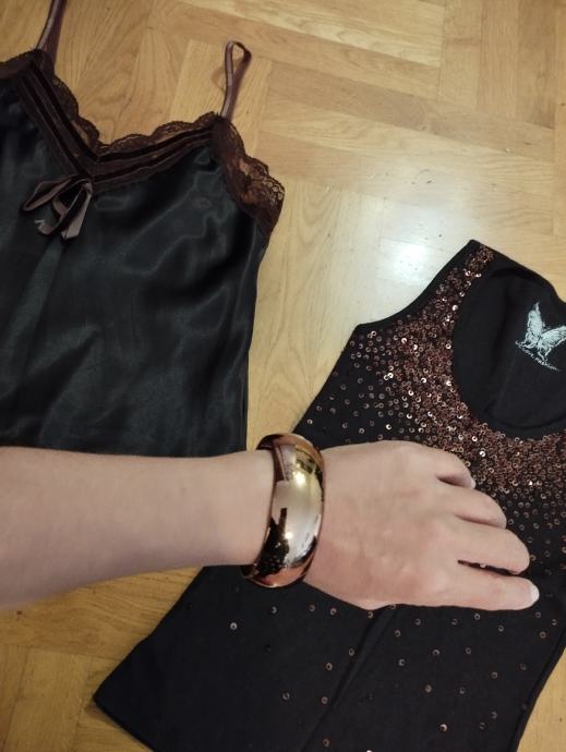 Prodajem dva topa,jedan satenski a drugi pamucni sa sljokicama. Noseno jedanput. Uz to ide i vestica iz Zare,te narukvica boje bronce. Sve pase kao komplet,sve je SMEĐE boje.Samo za 100 kn. Velicina je S.