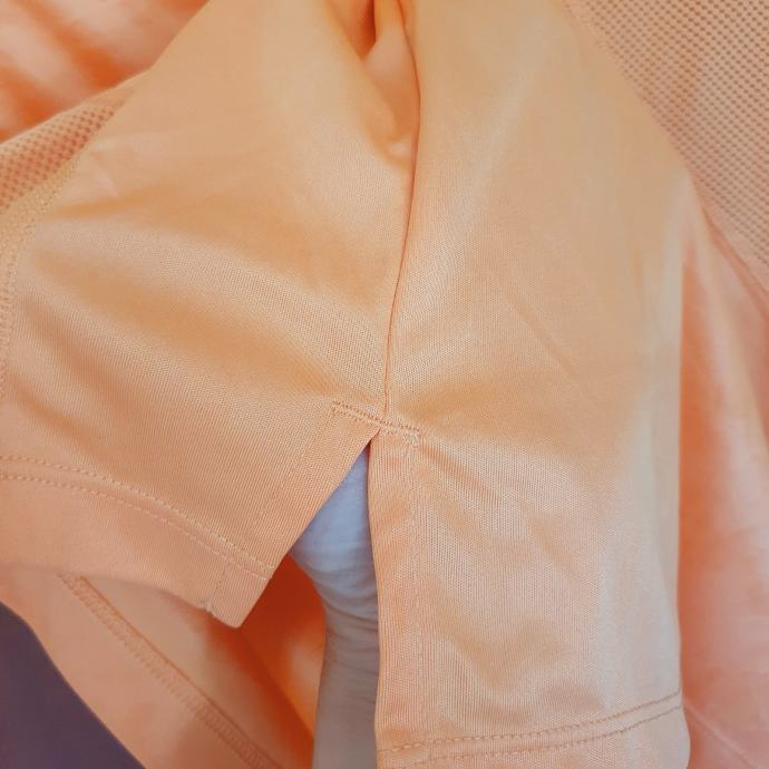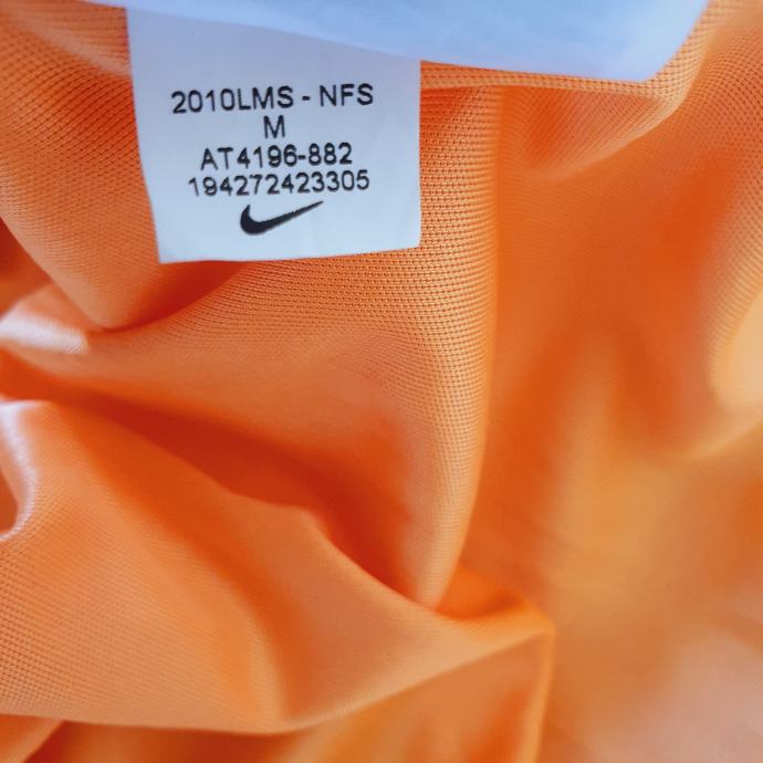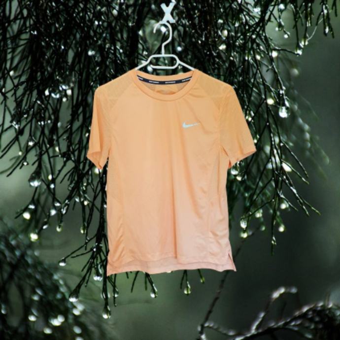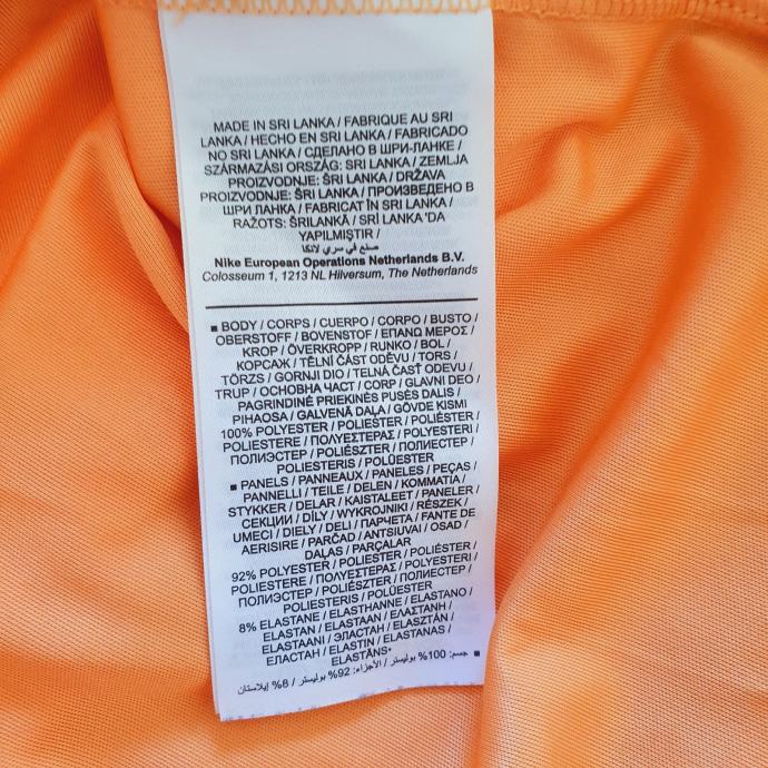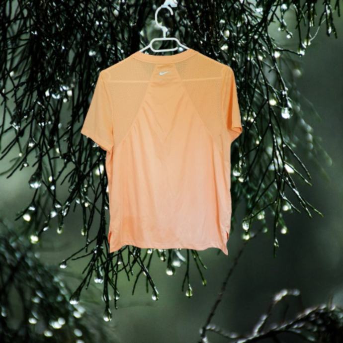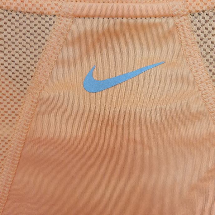 Nike majica za trčanje u nježnoj narančastoj boji s prepoznatljivim logom. Boja je jača uživo i odgovara onoj na zadnjoj fotografiji. Majica je veličine 38, idealna za sportske aktivnosti ili svakodnevno nošenje. Udoban materijal koji odvodi vlagu čini ju savršenim izborom za aktivne žene. Mjere su prsa 49 cm, dužina naprijed 58 cm, dužina iza 61 cm. Sastav je 92% poliester, 2% elastin.