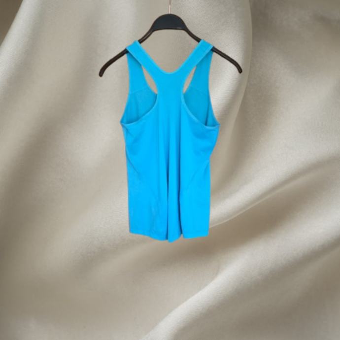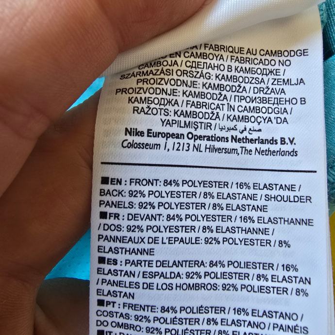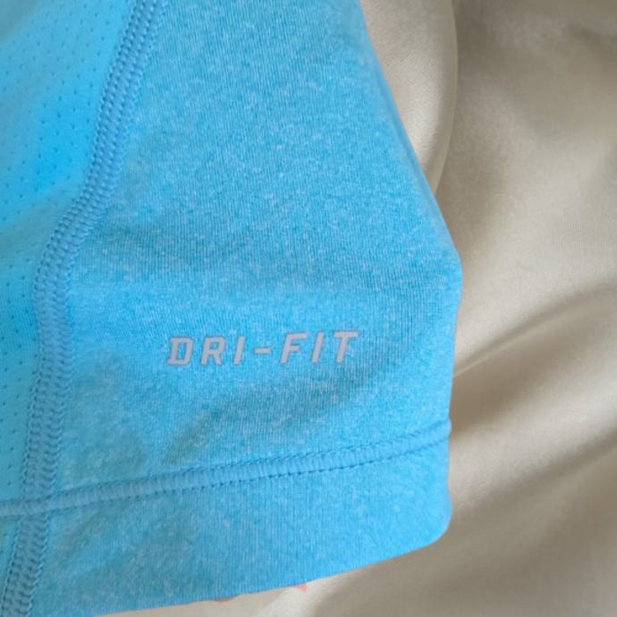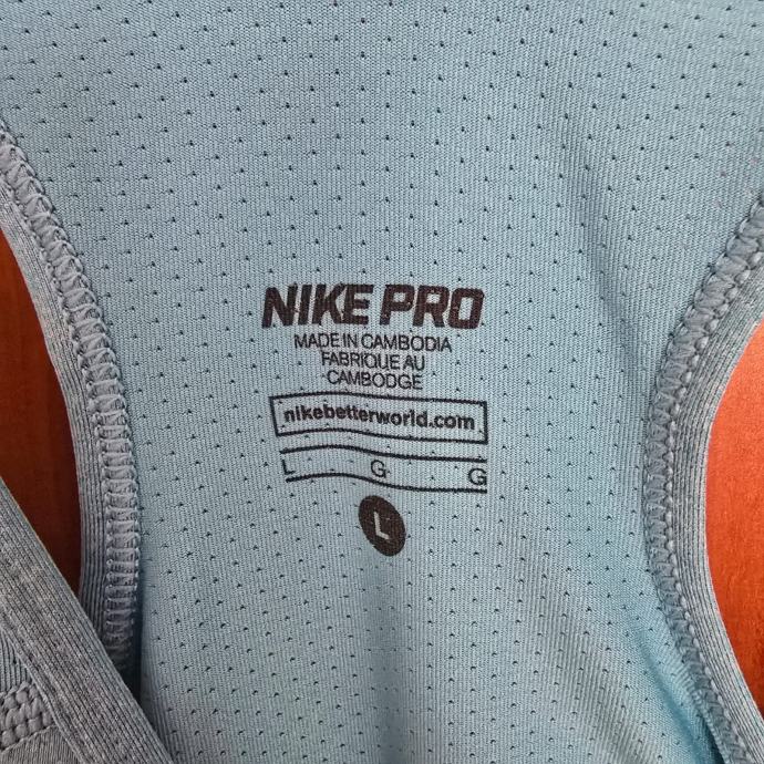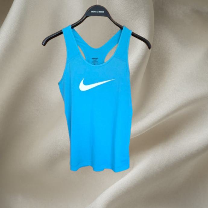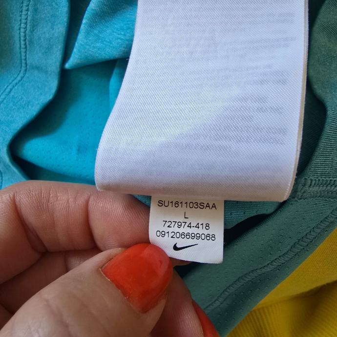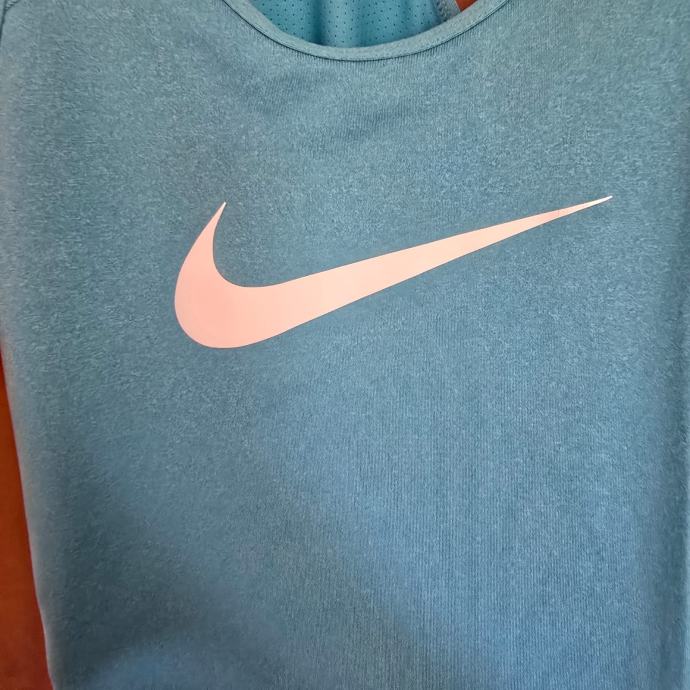 Tirkizna plava sportska majica Nike veličina L, ali više odgovara veličini M. Mjere su prsa 52 cm, dužina naprijed 63 cm, dužina iza 69 cm. Sastav je 84% poliester, 16% elastin.