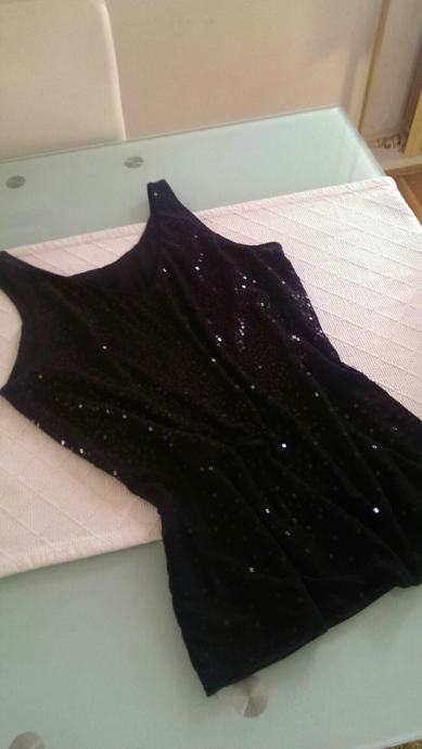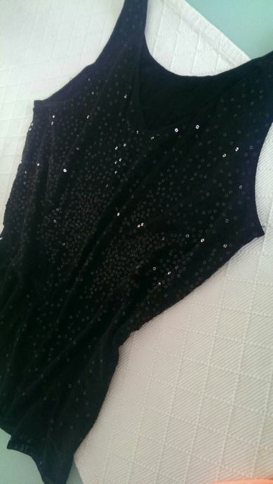 crni , jedanput koristen. Podstava od lagane lycre ,steznik za formiranje figure. Naprijed je cijeli svjetlucav, otraga potpuno crn.