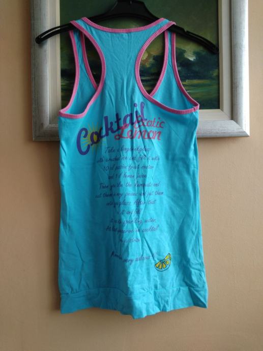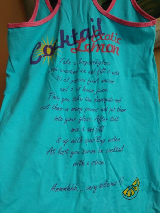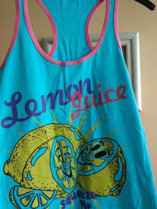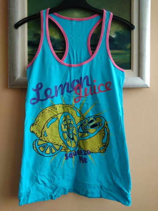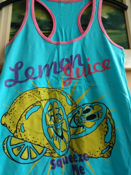Otkačena ljetna majica bez rukava, vel S, nova i nenošena, nema etiketu, ima okrugli izrez, naprijed motiv limuna i natpis squeeze me, otraga recept za voćni koktel, jako efektna.