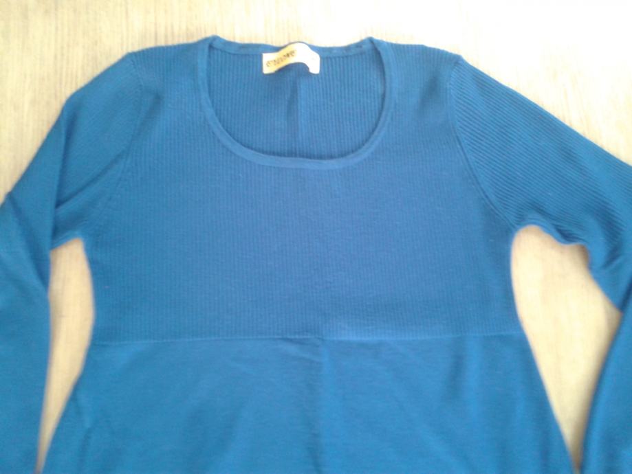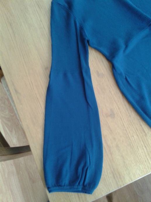 Plava majica, veličina S, rastezljiva, udobna za nositi. Neobičnog kroja, rukavi idu iz užega u širje, od prsa se majica također širi, kao sto se vidi na fotografijama. Okrugli izrez, nosena 2 puta, kao nova.