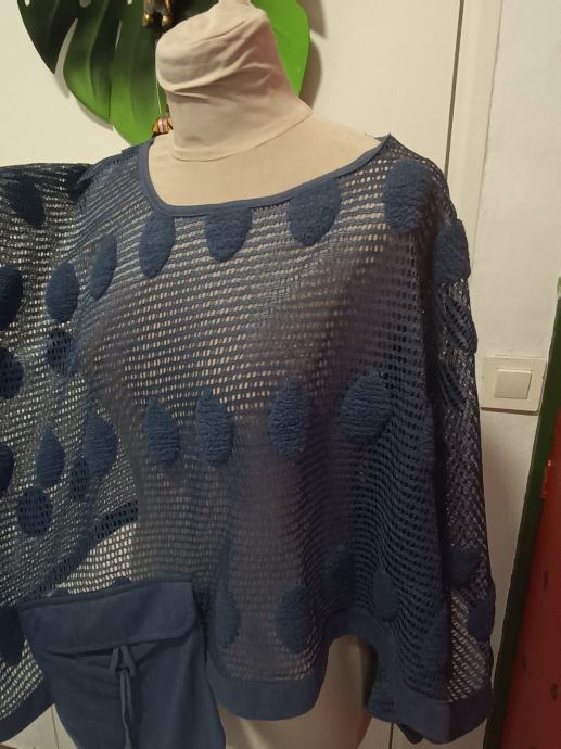 Plava mrežasta tunika s teksturiranim točkama. Opuštenoga kroja, okrugli izrez. Veliki džep, Nosi se kao modni dodatak iznad majice, dolčevite, košulje... Široki rukavi. RAđeno u jednom pravokutniku. Vrlo posebna francuska marka.