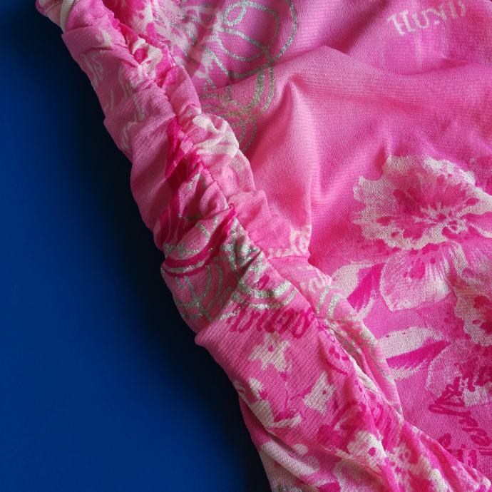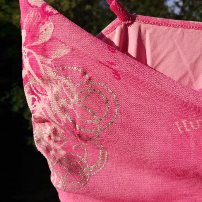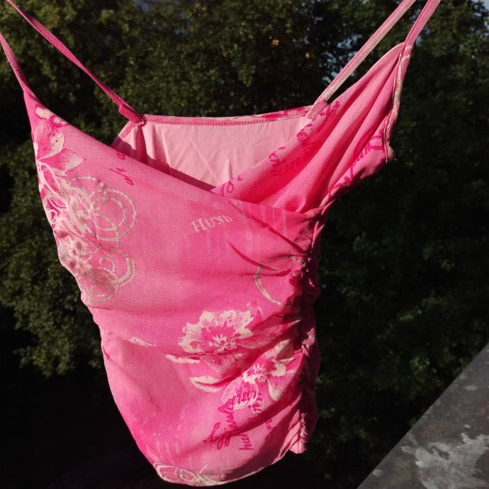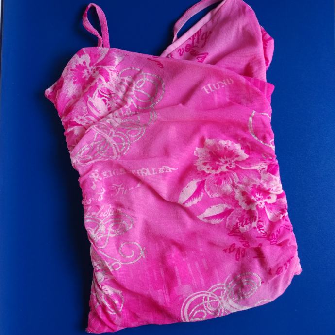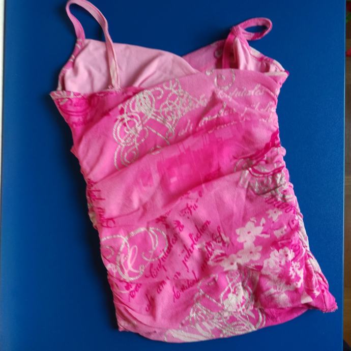 Predivna uska majica Barbie roze boje, uzorak: bijeli cvijetovi i srebrne linije.