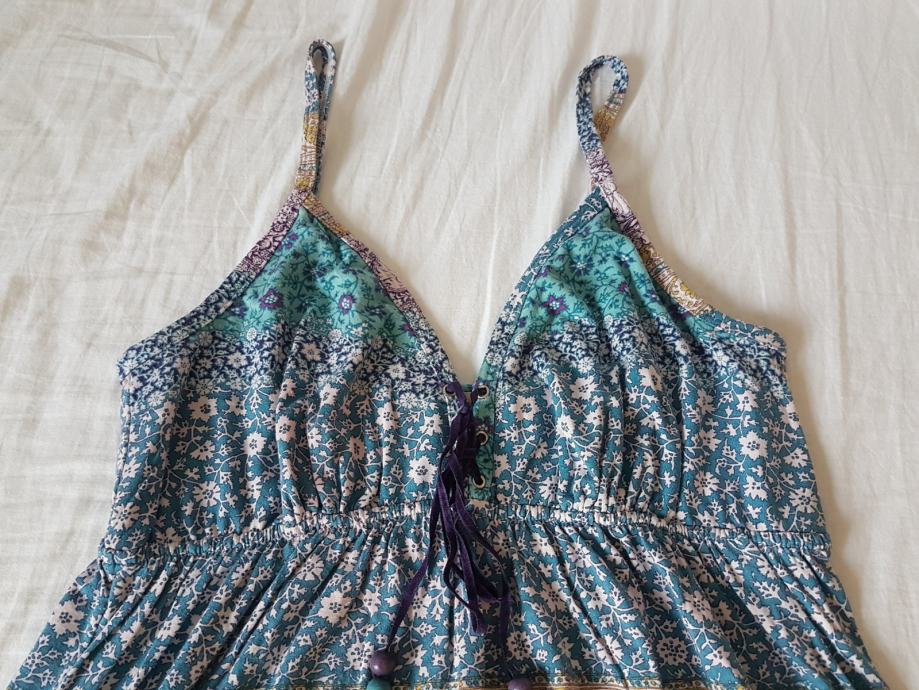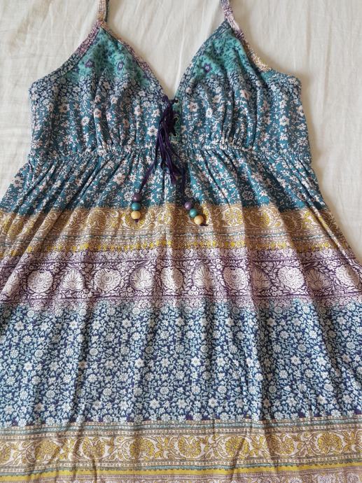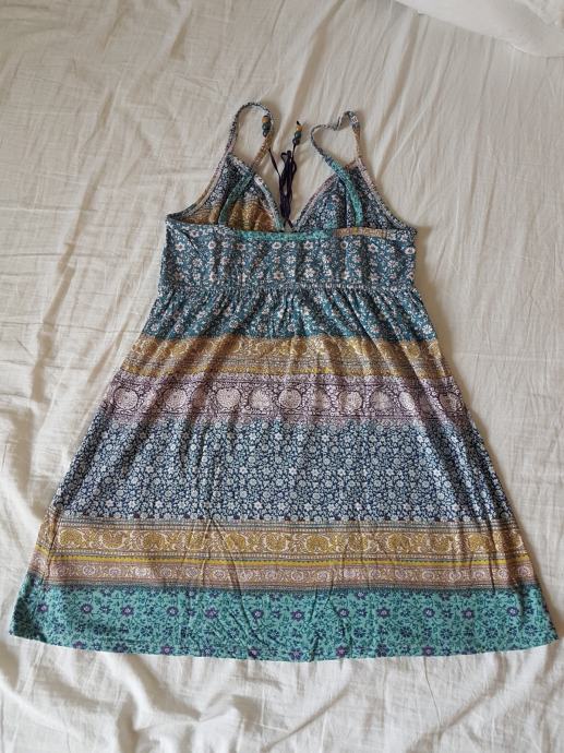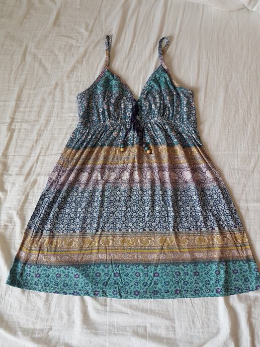 Šareni top na bretele, laganog materijala, ugodnog za nositi. Ima gumicu ispod grudi pa se prilagođava širini prsa. Veličina 40 (L). Nošen, ali očuvan.