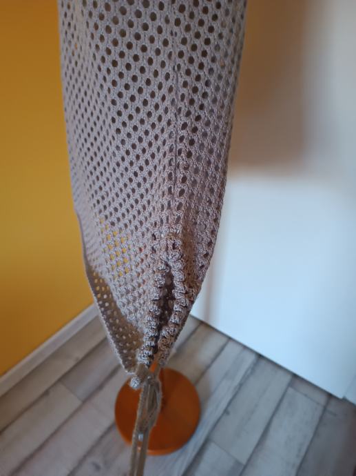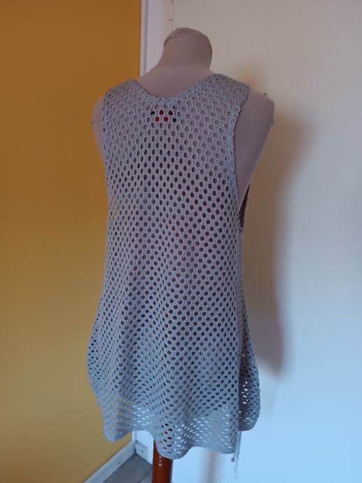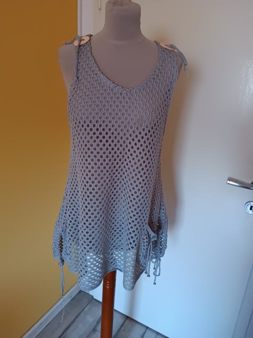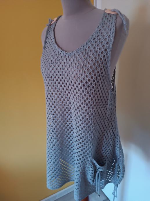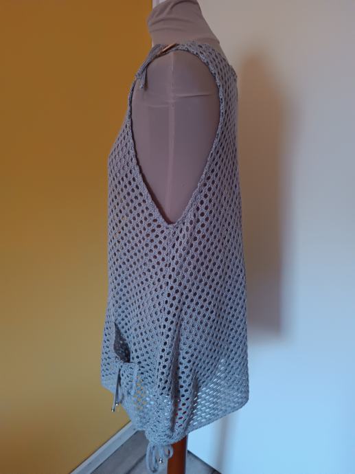 Siva tunika bez rukava. Mrežasti dizajn. Na ramenima su ukrasni elementi (vezice i gumbi).