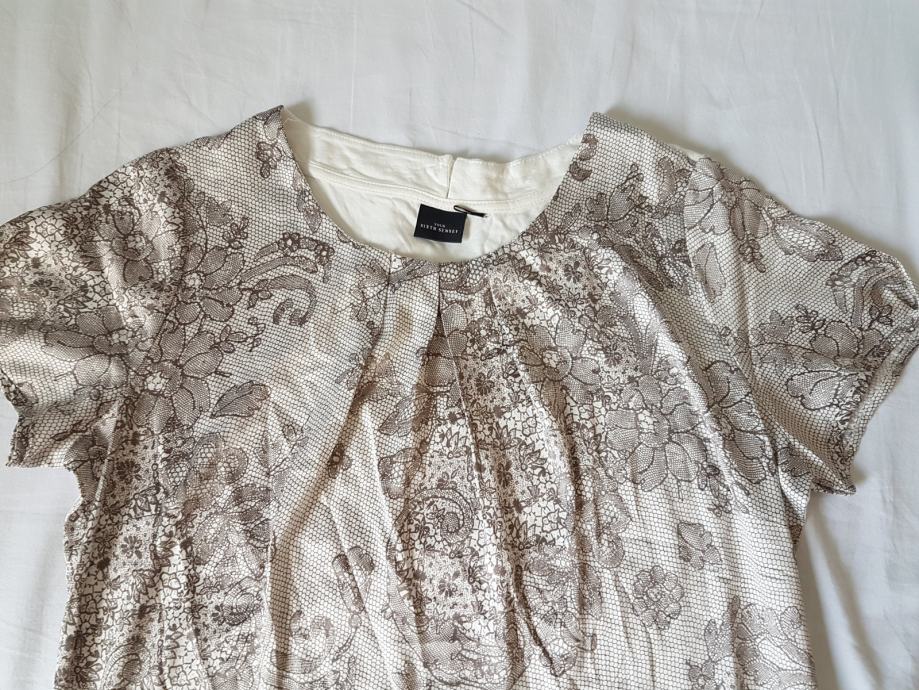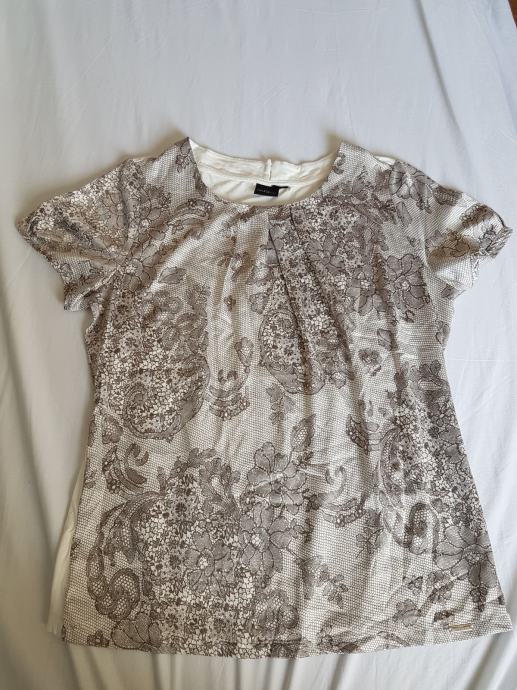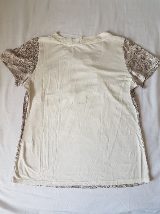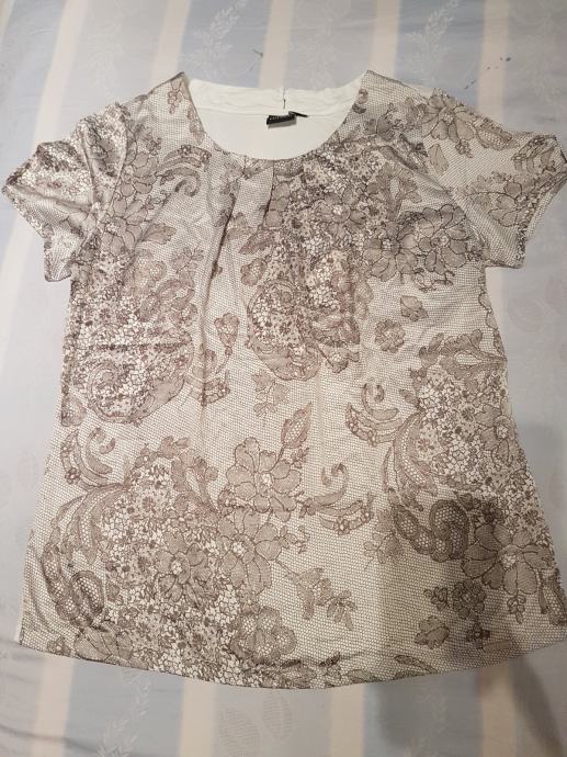 Majica koja s prednje strane ima svilenkasti materijal, krem boje sa smeđim čipkastim uzorkom, a odostraga je krem boje lagani rastezljivi materijal. Minimalno je nošena, bez tragova nošenja. Veličina je 40 (L).