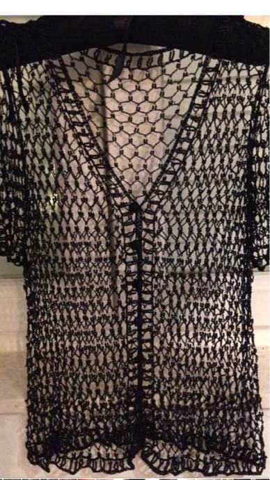 Zanimljiv ukrasni vezeni top cijeli izrađen od perlica ručnim radom na finom svilenom koncu....na prednjici crni vezeni gumbići... lijepo pada...efektan...podiže svaku odjevnu kombinaciju casual-večernju...nenošen!