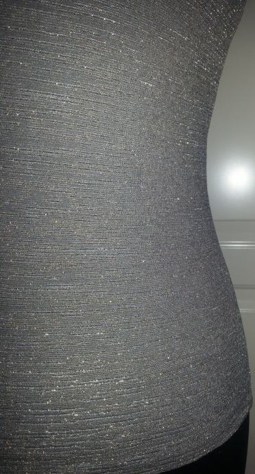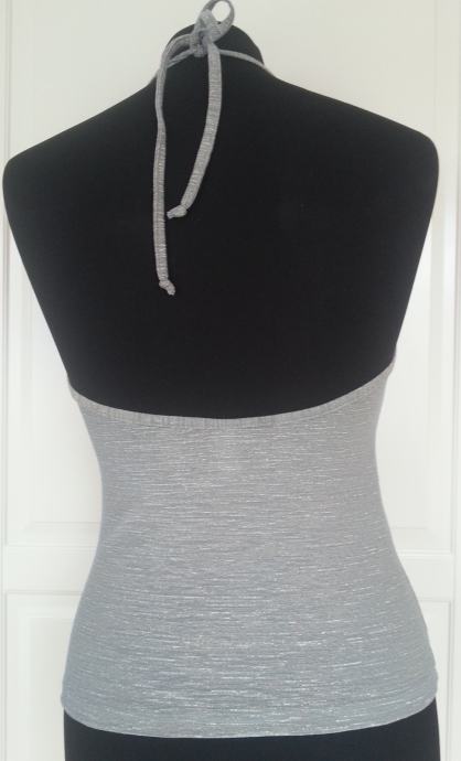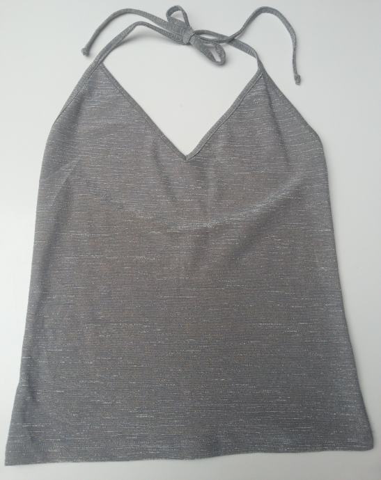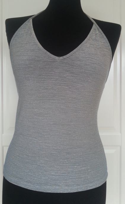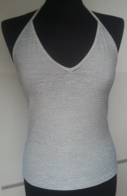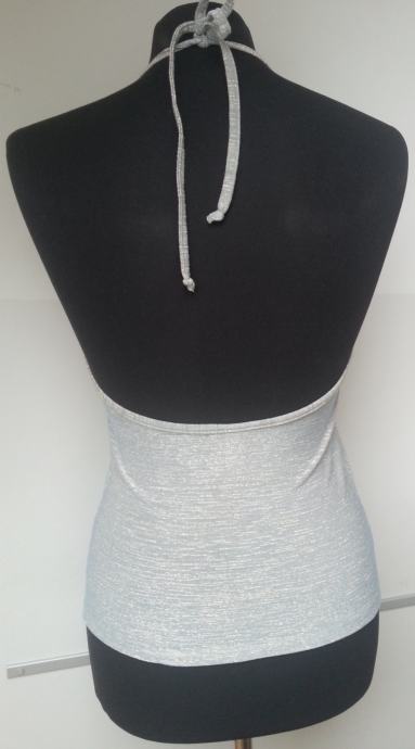 Svjetlucavi top,svijetlo plave boje sa zlatnim odsjajem, kupila sam ga zbog posebnosti materijala jer podigne kombinaciju kad se nosi ispod sakoa na jednobojno odijelo. Veže se trakama oko vrata, gola leđa. odgovara 34-38 veličini. Jako lijepo pristaje plavušama.